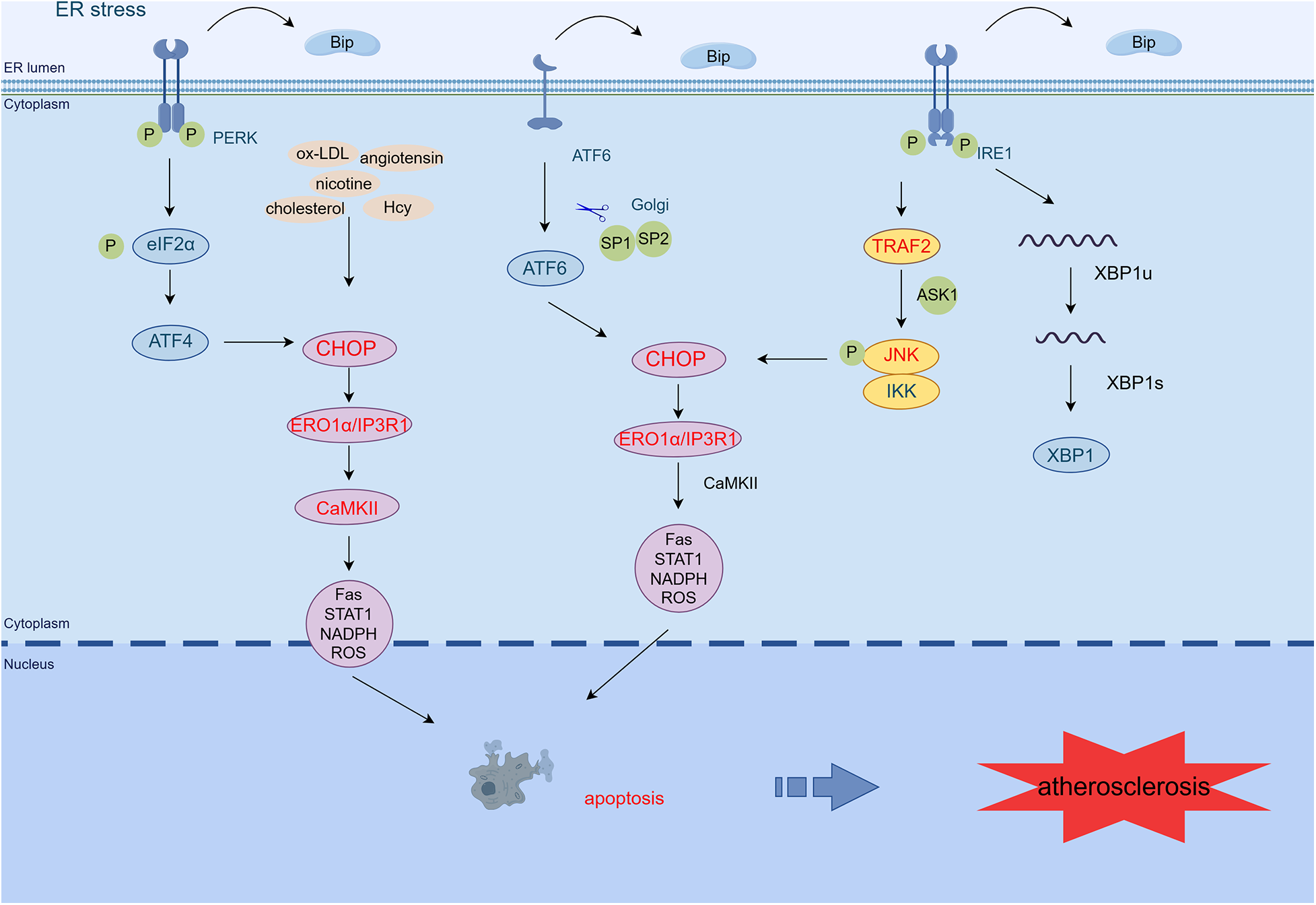 ER stress mediates apoptosis in AS. PERK/eIF2α/ATF4, IRE1α/JNK/MAPK, and ATF6 signaling pathways activate CHOP, which transcribes ERO1α, enhances IP3R1 calcium channel activity, and activates CaMKII. CaMKII activates many pro-apoptotic pathways (Fas, STAT1, NADPH, ROS), leading to macrophage apoptosis. In addition, atherosclerosis-related stressors in endothelial cells (such as oxidized low-density lipoprotein, homocysteine, nicotine, and angiotensin) can activate PERK, IRE1, ATF6, and CHOP/ERO1α signaling pathways and promote cell apoptosis and vascular endothelial dysfunction. Exposure of smooth muscle cells to cholesterol activates the PERK/eIF2α/ATF4 pathway, promoting apoptosis (By Figdraw.) TRAF2, tumor necrosis factor (TNF) receptor-associated factor-2; JNK, c-Jun N-terminal kinase; ASK1, apoptotic signaling kinase-1; IKK, IκB kinase; CHOP, C/EBP-homologous protein; ERO1α, endoplasmic reticulum oxidoreductase 1 alpha; IP3R1, inositol 1,4,5-trisphosphate receptor type 1; CaMKII, calcium/calmodulin-dependent protein kinase II; Hcy, homocysteine.