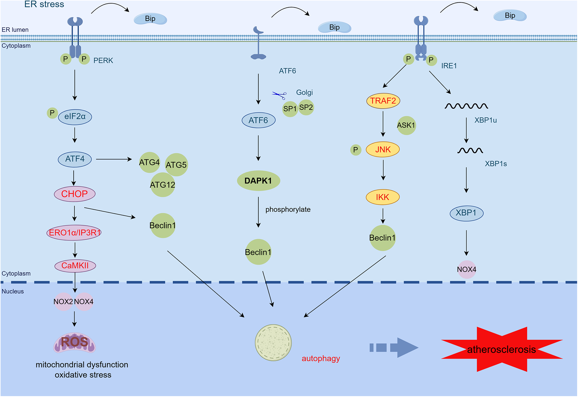 ER stress mediates mitochondrial dysfunction, oxidative stress, and autophagy in AS. CHOP activates the ERO1α/CaMKII signaling pathway by transcription and increases the production of NOX2, NOX4, and ROS, thereby inducing oxidative stress and mitochondrial dysfunction. PERK/eIF2α/ATF4 activates upregulation of autophagy genes such as ATG4, ATG5, and ATG12. The PERK/eIF2α/ATF4 and IRE1α/JNK signaling pathways also induce autophagy by increasing free Beclin1. ATF6 regulates autophagy by upregulating the expression of DAPK1, which phosphorylates Beclin1 (By Figdraw.) TRAF2, tumor necrosis factor (TNF) receptor-associated factor-2; JNK, c-Jun N-terminal kinase; ASK1, apoptotic signaling kinase-1; IKK, IκB kinase; CHOP, C/EBP-homologous protein; ERO1α, endoplasmic reticulum oxidoreductase 1 alpha; IP3R1, inositol 1,4,5-trisphosphate receptor type 1; CaMKII, calcium/calmodulin-dependent protein kinase II; DAPK1, death-associated protein kinase 1; ROS, reactive oxygen species.