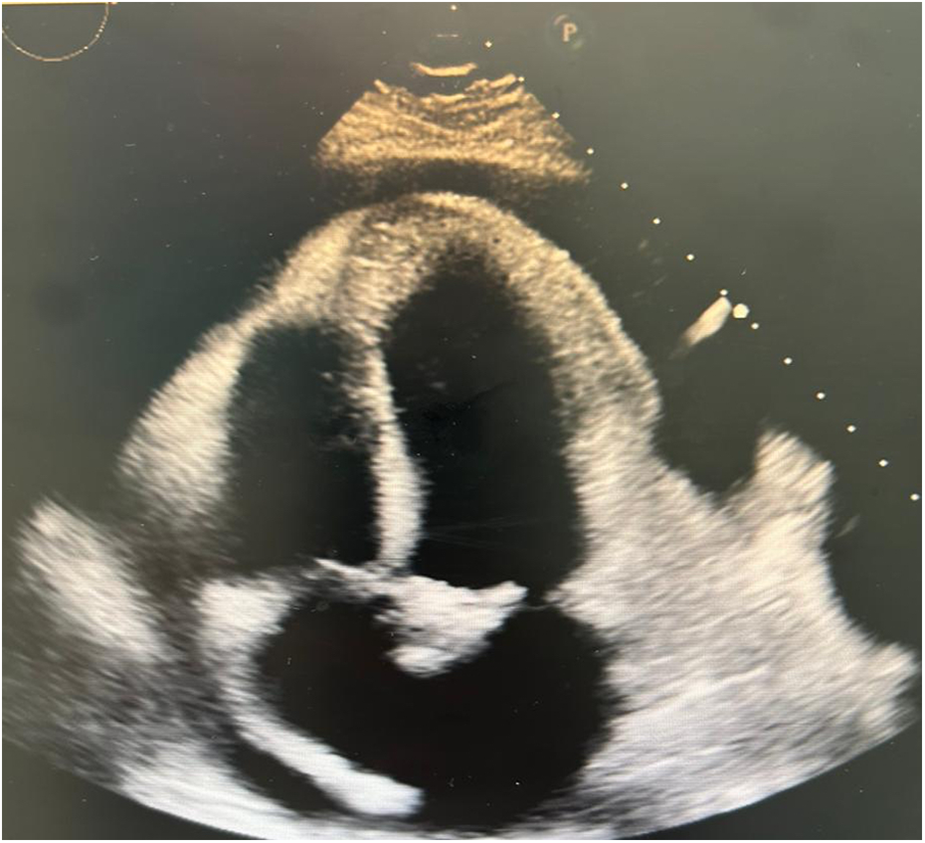 The electrocardiogram showed sinus tachycardia (Figure 1) and chest x-ray demonstrated mediastinal widening. Laboratory results are shown in Table 1. The echocardiographic study showed a left ventricular ejection fraction of 65%, mitral E wave velocity of 134 cm/s, and mitral A wave velocity of 121 cm/s. E/e': 20. Mild calcified aortic valve stenosis and severe pericardial effusion without signs of tamponade (Figure 2).