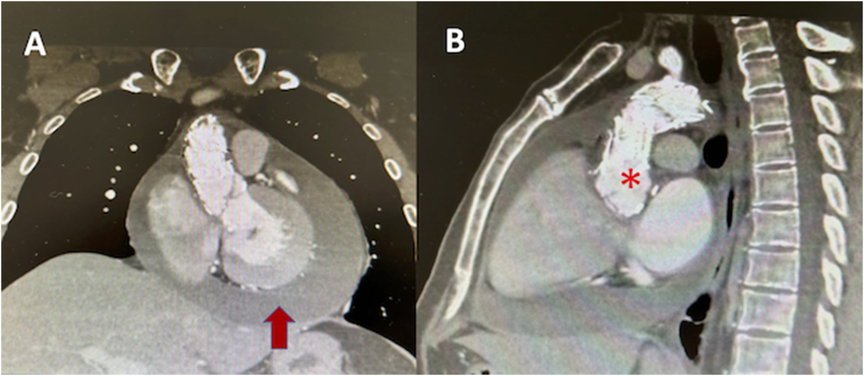 Angio CT of aorta (A) coronal axis showing pericardial effusion (red arrow), (B) endovascular material in ascending aorta (asterix).