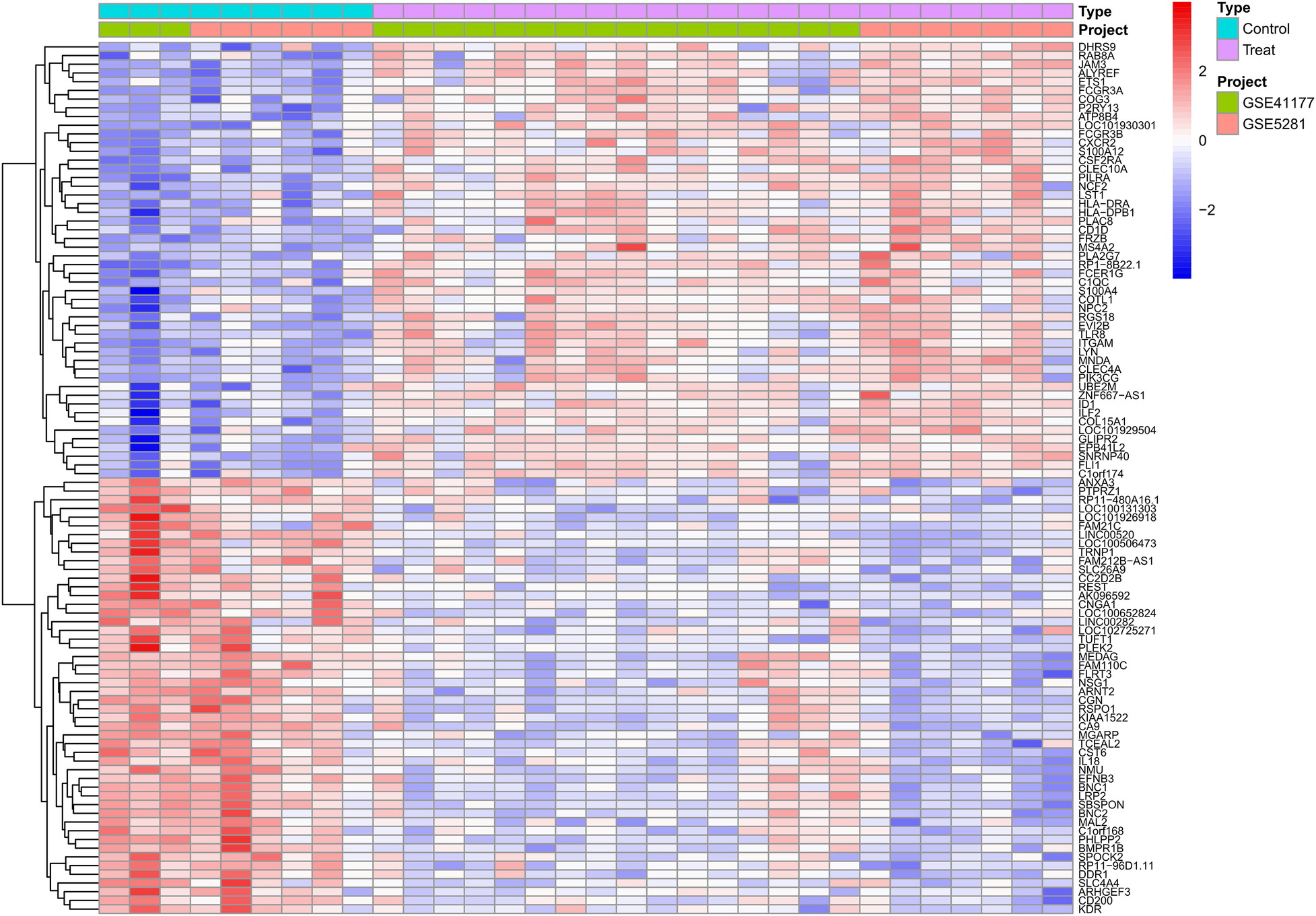 Differential expression gene heatmap. Red modules represent upregulated genes; blue modules represent downregulated genes.