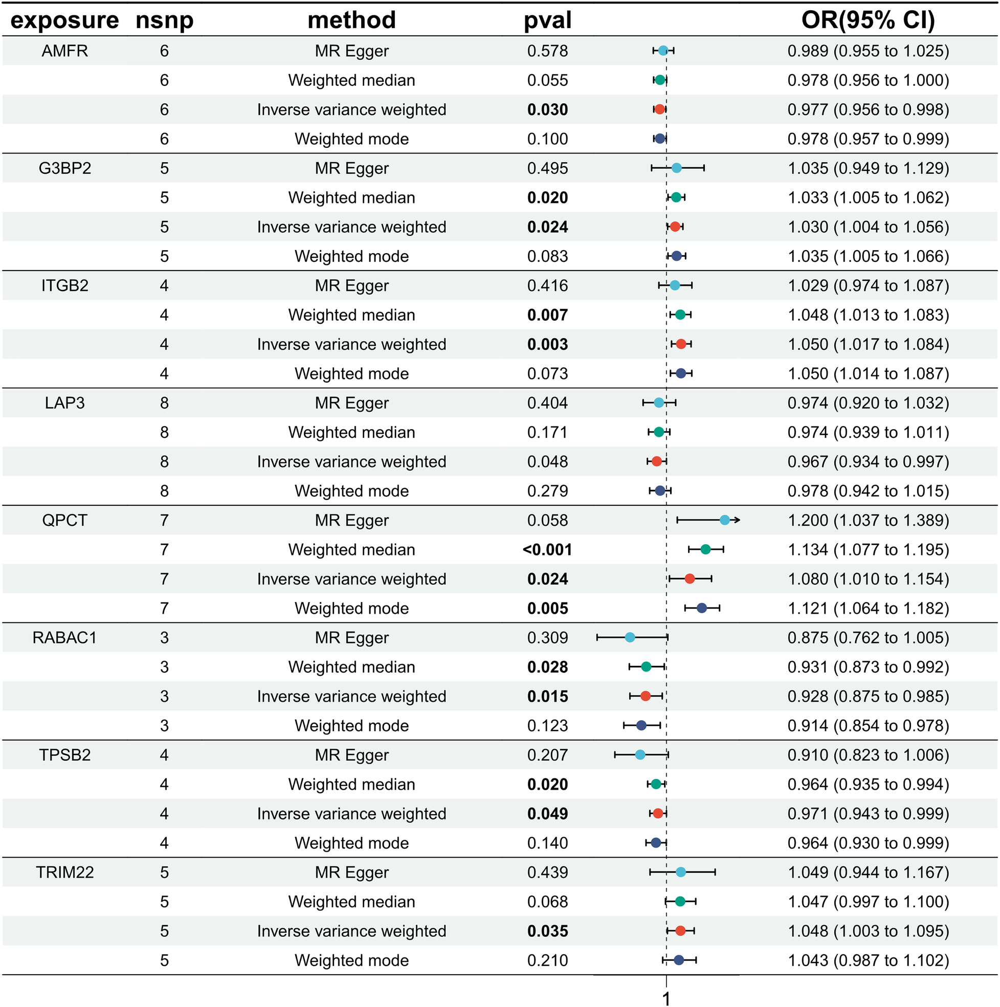Exploring the causal relationships between 19,942 eQTLs and AF, we discovered 1,811 eQTLs causally linked to the onset of AF. By overlaying these eQTLs with the 355 DEGs, we identified 8 candidate genes (CGs) shown in Figure 3: automatic mobility factor receptor (AMFR), leucine aminopeptidase 3 (LAP3), Rab acceptor 1 (RABAC1), tryptase beta 2 (TPSB2), GTPase activating SH3 domain binding protein 2 (G3BP2), integrin subunit beta 2 (ITGB2), Glutaminyl Pettide Cycle transfer (QPCT), and (TRIM22). IVW analysis indicated that AMFR [OR = 0.977; 95% CI, 0.956–0.998; P = 0.030], LAP3 [OR = 0.967; 95% CI, 0.934 0.997; P = 0.048], RABAC1 [OR = 0.928; 95% CI, 0.875 0.985; P = 0.015], and TPSB2 [IVW: OR = 0.971; 95% CI, 0.943 0.999; P = 0.049] were inversely correlated with AF risk. Conversely, G3BP2 [OR = 1.030; 95% CI, 1.004–1.056; P = 0.024], ITGB2 [OR = 1.050; 95% CI, 1.017–1.084; P = 0.003], QPCT [OR = 1.080; 95% CI, 1.010–0.997; P = 1.154], and TRIM22 [IVW: OR = 1.048; 95% CI, 1.003–1.095; P = 0.035] were associated with an increased risk of AF. The WM, MR-Egger, Simple model, and Weighted model analyses corroborated the direction of the IVW results (Figure 4).