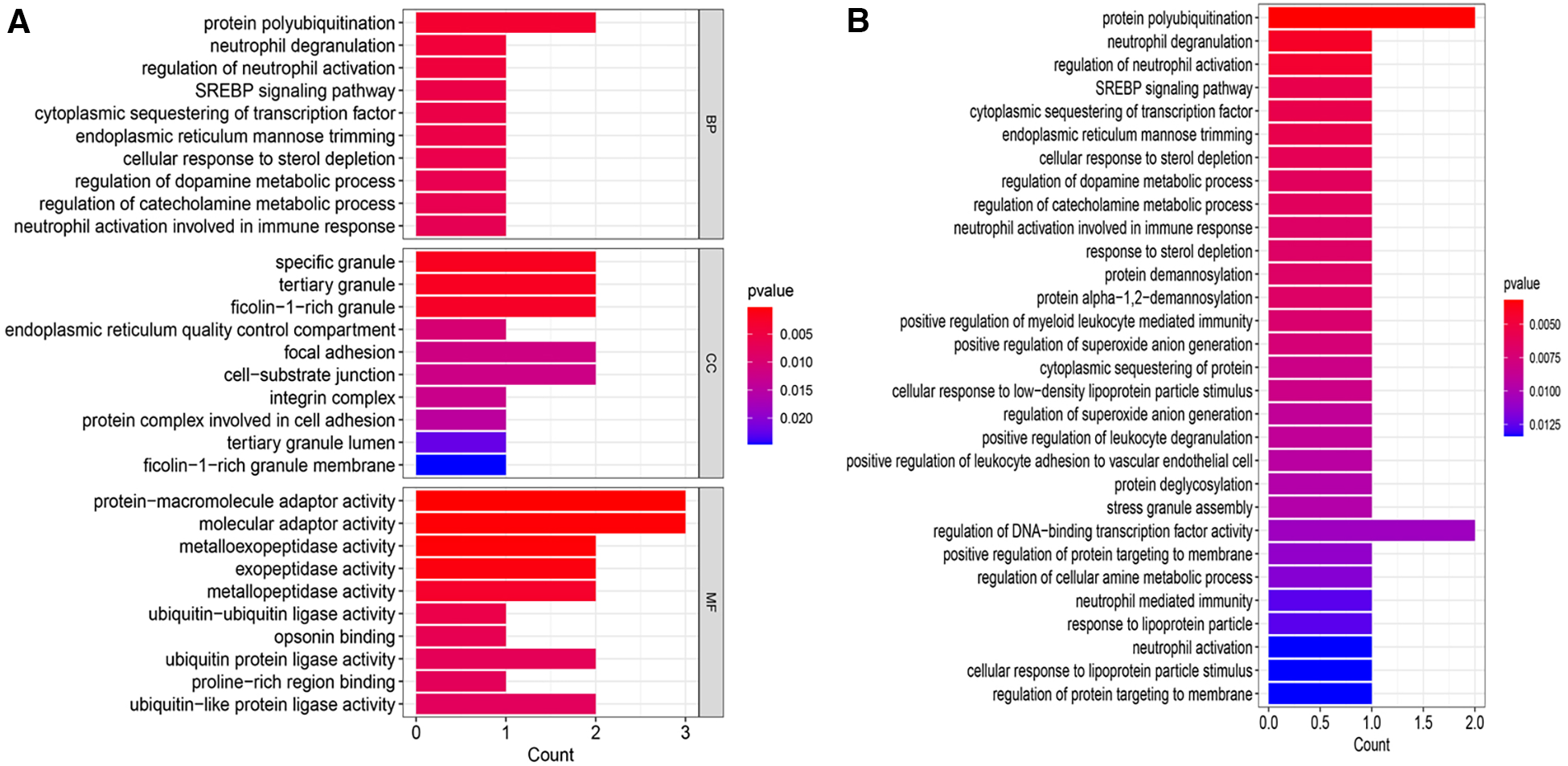 Enrichment analysis. (A) GO enrichment analysis bar chart. (B) KEGG enrichment analysis bar chart. BP, biological process; CC, cellular component; MF, molecular function.