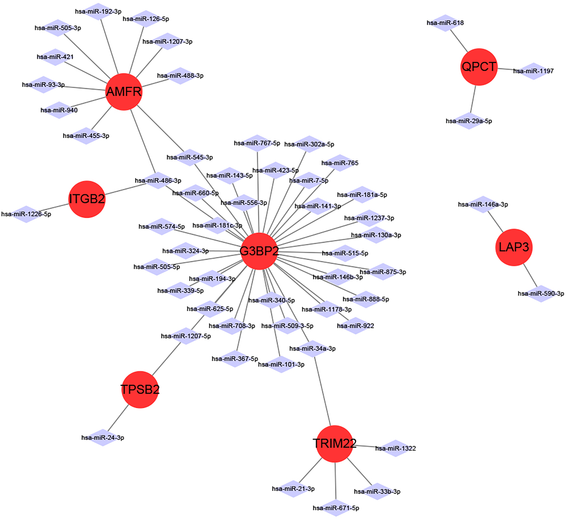miRNAs are a class of small non-coding RNA molecules that can regulate gene expression. In our study, we analyzed the interactions between eight intersecting genes and miRNAs using TargetScan, miRDB and miRanda databases databases, respectively, in order to construct mRNA-miRNA networks (Figure 6). We identified 7 intersecting genes (AMFR, LAP3, TPSB2, G3BP2, ITGB2, QPCT, and TRIM22) that could regulate miRNAs. In addition, we obtained a total of 55 miRNAs regulating intersecting genes, 11 regulating AMFR, 2 regulating LAP3, 2 regulating TPSB2, 34 regulating G3BP2, 2 regulating ITGB2, 3 regulating QPCT, and 5 regulating TRIM22.