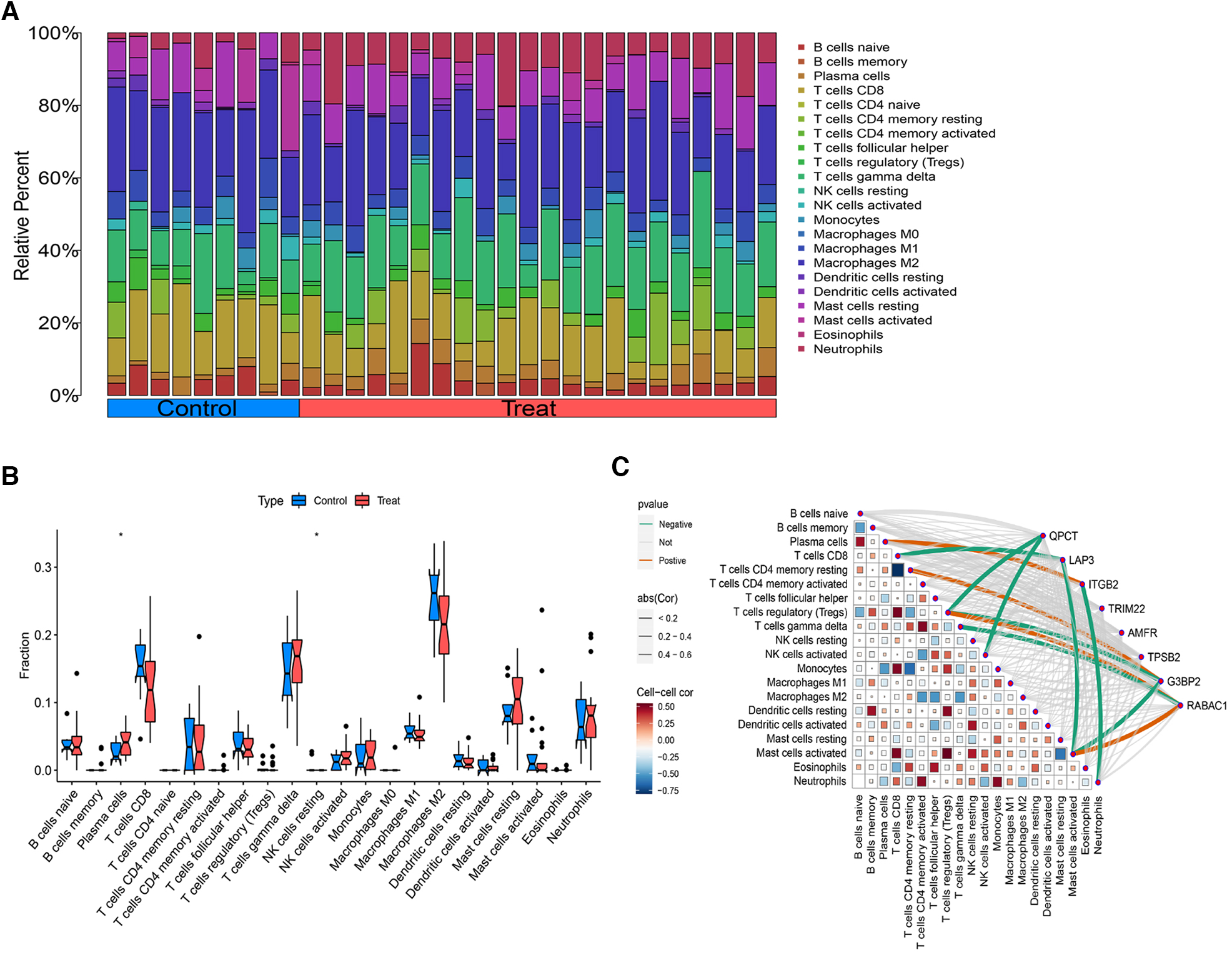 Analysis of immune cell infiltration. (A) The distribution of immune cells in each sample. (B) Differentially expressed immune cells between AF and SR samples. (C) Correlation analysis between immune cells and the 8 intersecting genes.