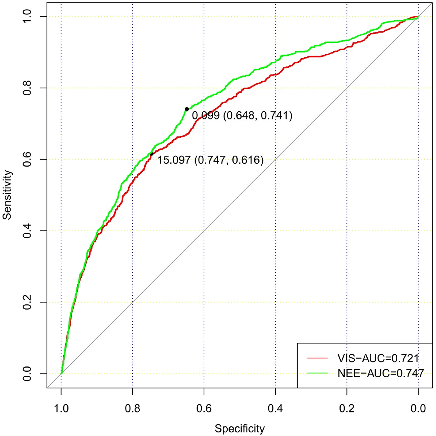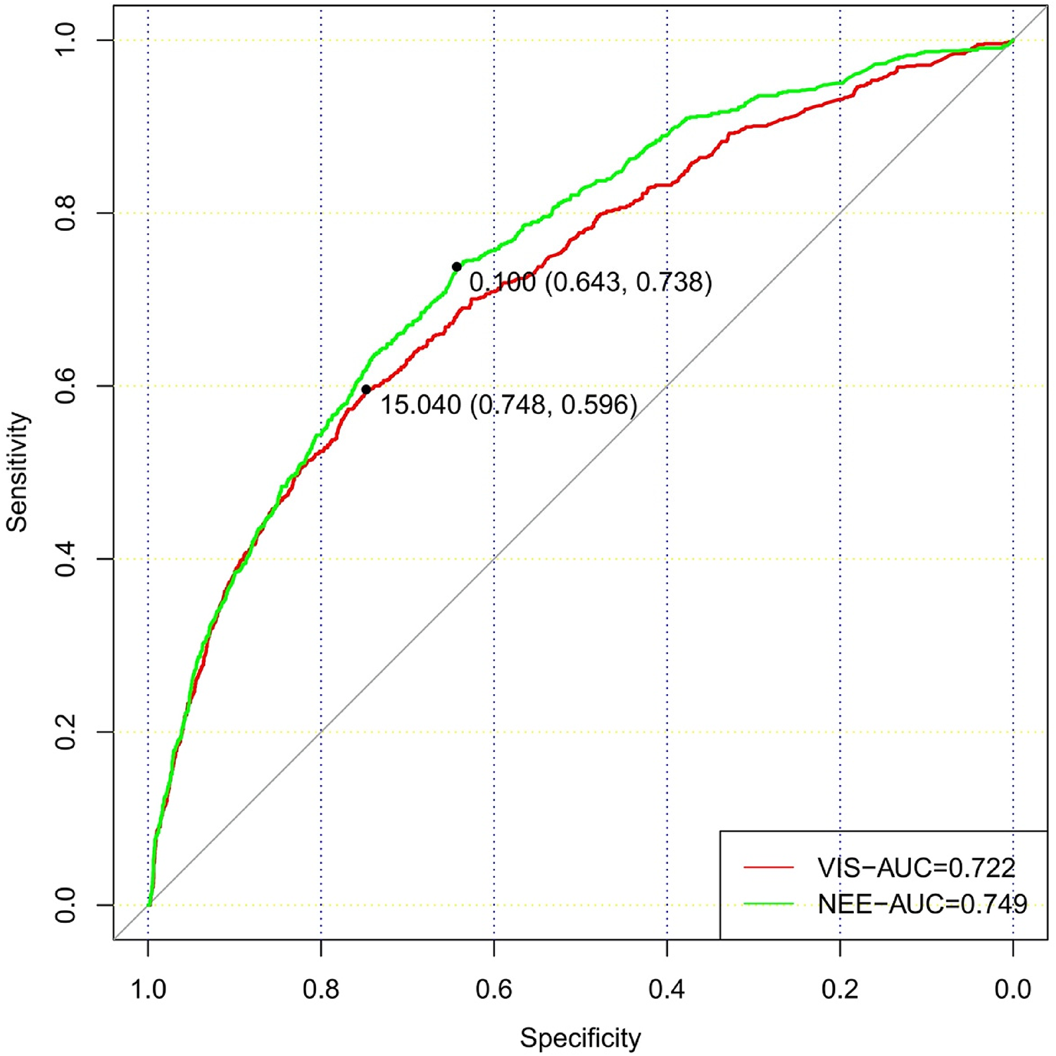 Supplementary Figure S2Comparison of the ability to predict 14-day mortality between the VIS and NEE score in the second hour. In the second hour, the AUC, sensitivity, and specificity values for the VIS = 15.040 cutoff value were 72.7%, 73.7%, and 61.1%, respectively. The AUC, sensitivity, and specificity values for the NEE score = 0.100 cutoff value were 75.3%, 63.1%, and 75.4%, respectively. VIS, vasoactive-inotropic score; NEE, norepinephrine equivalent; AUC, area under the receiver operating characteristic curve.