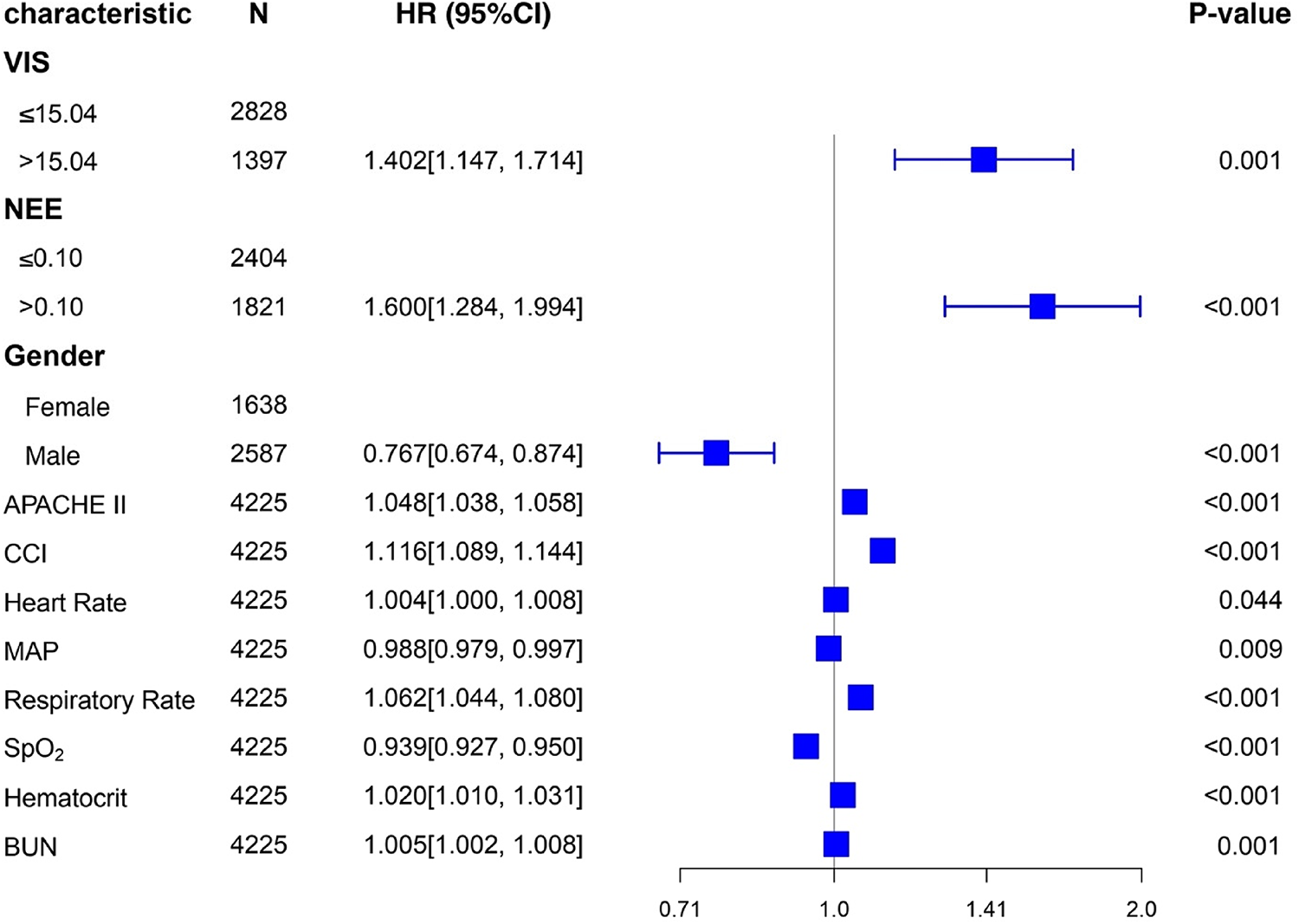 Supplementary Figure S5Forest plots of univariable hazard ratios for the primary endpoint in different variables. HR, hazard ratio; VIS, vasoactive-inotropic score; NEE, norepinephrine equivalent; SOFA, sequential organ failure assessment; APACHE II, Acute Physiology and Chronic Health Evaluation II; CCI, Charlson comorbidity index; MAP, mean arterial pressure; SpO2, oxygen saturation; WBC, white blood cell; BUN, blood urea nitrogen.