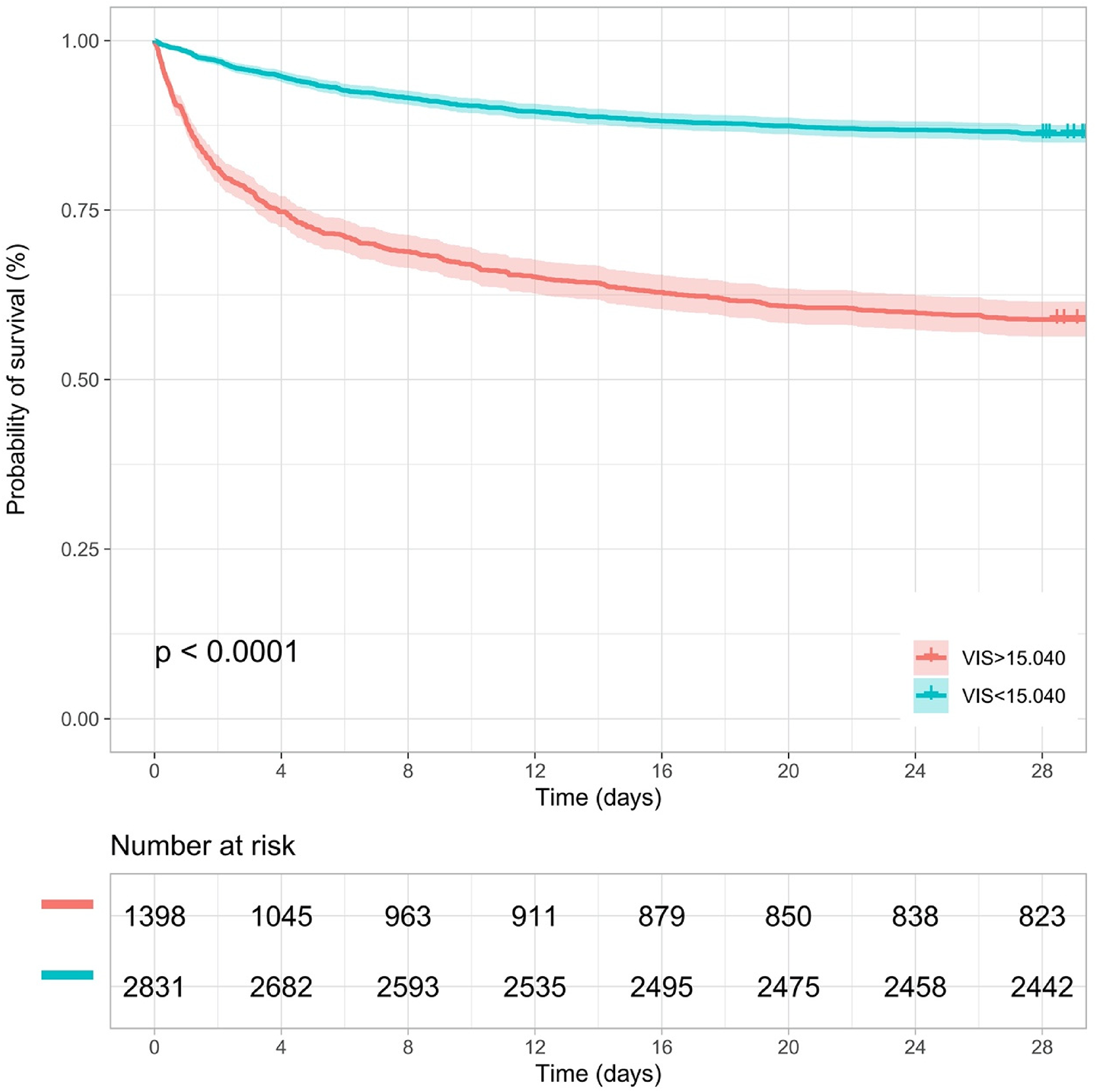 Patients received norepinephrine, epinephrine, dopamine, phenylephrine, dobutamine, milrinone, vasopressin, and angiotensin II; the median doses were 0.140 (0.209) µg/kg/min in 2,054 (48.57%) patients, 0.040 (0.060) µg/kg/min in 330 (7.80%) patients, 8.04 (10.0) µg/kg/min in 204 (4.82%) patients, 0.800 (1.00) µg/kg/min in 2,125 (50.25%) patients, 5.00 (4.26) µg/kg/min in 86 (2.03%) patients, 0.800 (1.00) µg/kg/min in 106 (2.51%) patients, 2.40 (0.007) U/min in 562 (13.29%) patients, and 0.020 (0.001) ng/kg/min in 4 (0.09%) patients. None of the patients received other drugs in the VIS or NEE score formulas. The VIS of the non-survivor group was much higher [20.0 (32.0) vs. 9.01 (10.3); p < 0.001] than those of the non-survivor and NEE score groups [0.200 (0.311) vs. 0.060 (0.107); p < 0.001] (Table 1).