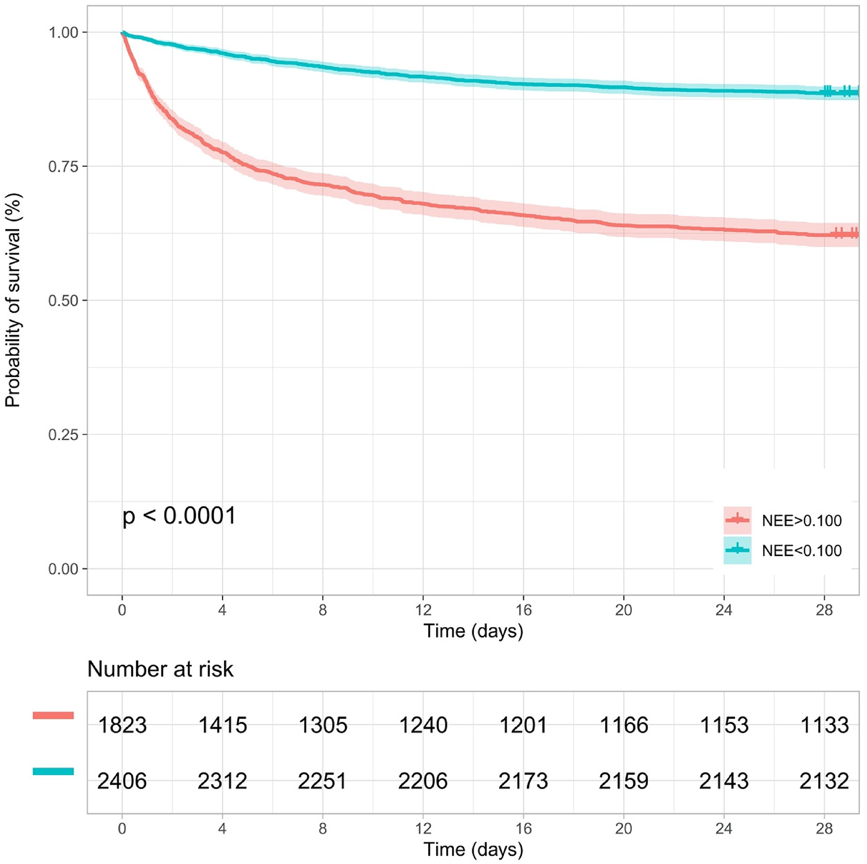 Comparison of the ability to predict 28-day mortality between the VIS and NEE score in the fourth hour.