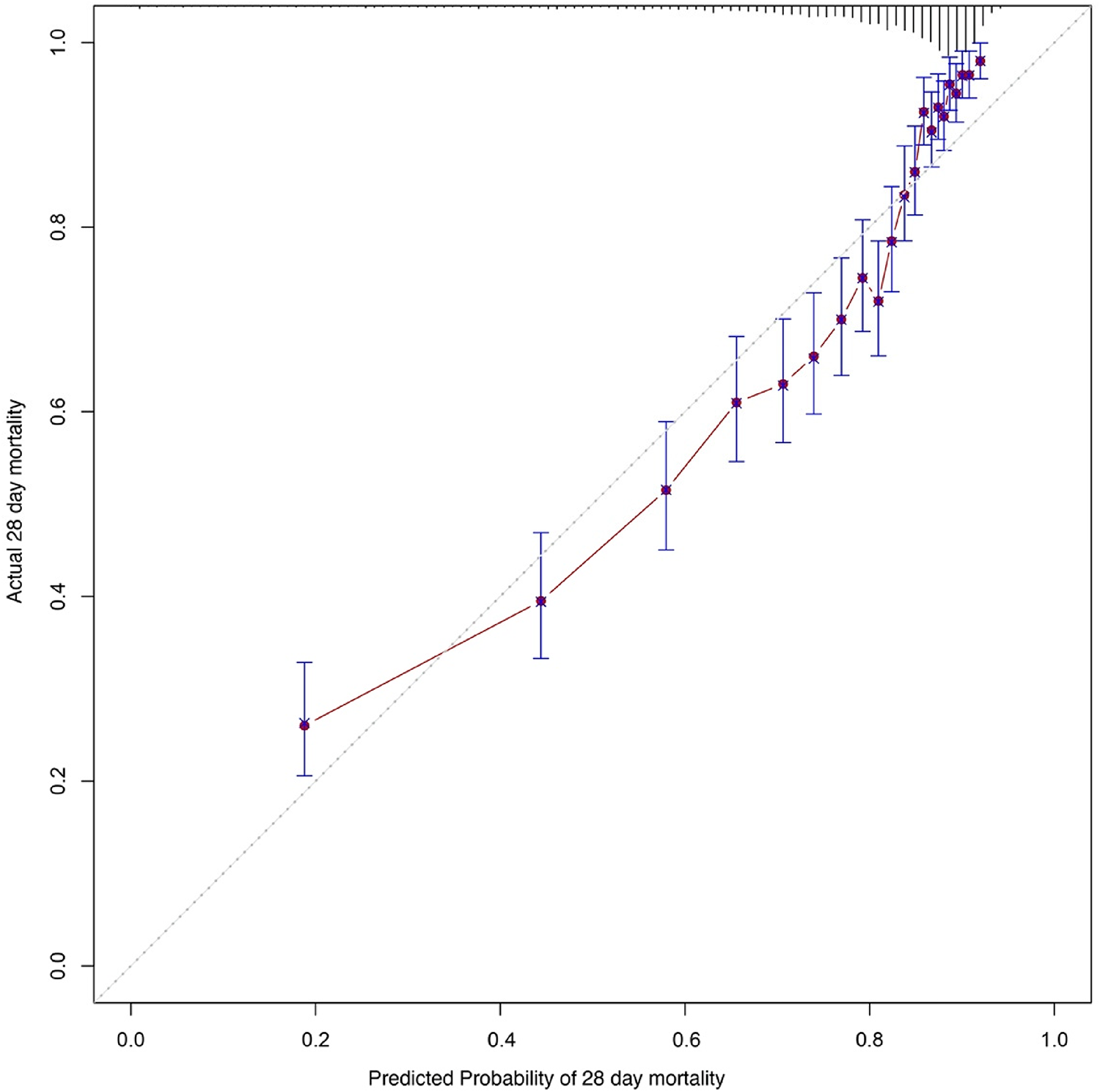 Supplementary Figure S7Calibration curves of the prognostic prediction of the nomogram based on the VIS in the second hour. The light gray line indicates the ideal reference line and the red line represents the performance of the nomogram. The closer the solid red line is to the light gray line, the better the predictive value of the model.