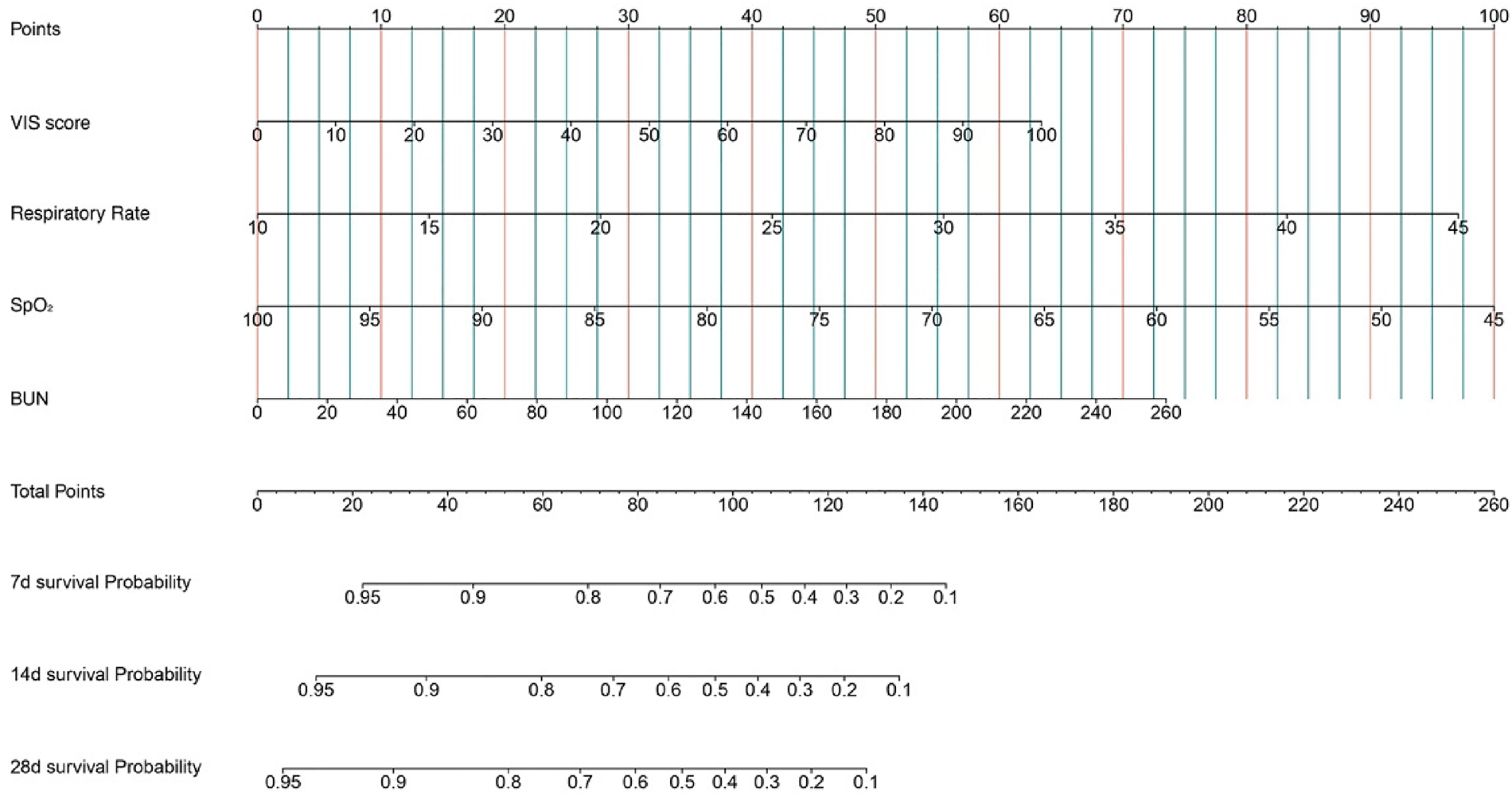 The present study encompassed 9,032 patients diagnosed with sepsis who received vasoactive therapy, of which 4,229 patients were further analyzed at the second hour after the onset of sepsis. Distinct variations in demographic data were observed between survivors (n = 3,265, 77.21%) and non-survivors (n = 964, 22.79%). Multivariate analysis indicated that several factors, including VIS >15.04 (p = 0.001), NEE >0.10 (p < 0.001), heart rate (p = 0.045), mean arterial pressure (p = 0.009), respiratory rate (p < 0.001), oxygen saturation (p < 0.001), blood urea nitrogen (BUN) (p = 0.001), and the Acute Physiology and Chronic Health Evaluation II (p < 0.001), were significantly associated with 28-day mortality in the patients with sepsis. The NEE score, respiratory rate, oxygen saturation, and BUN were incorporated into the nomogram model with a concordance index of 0.779 and an area under the curve of 0.802 (95% CI 0.787–0.818).