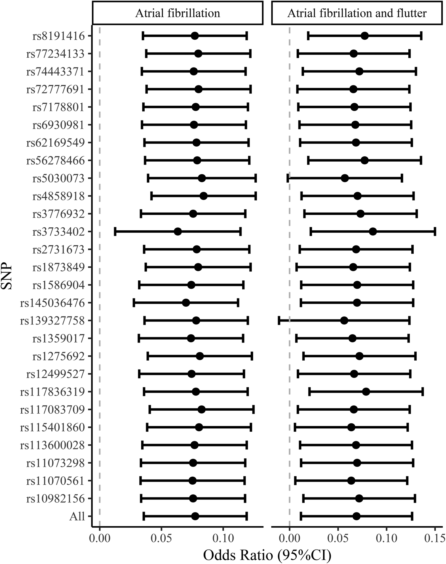 The leave-one-out analysis of the causal association between VEGF-D and the risk of atrial fibrillation and atrial fibrillation and flutter. VEGF, vascular endothelial growth factor.