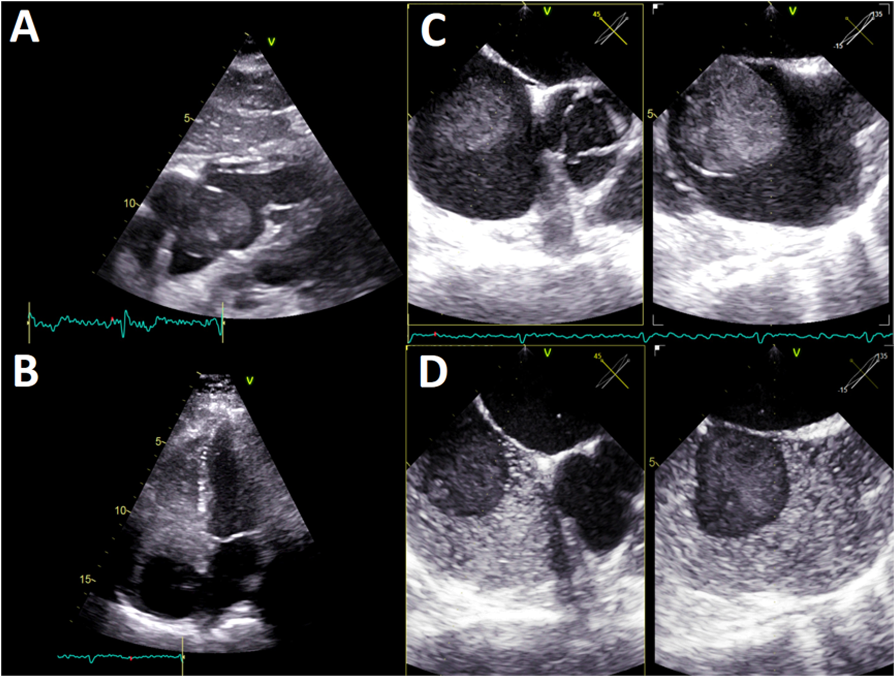(A) TTE, four-chamber subcostal view. Ovoid mass in the right atrium, with echogenicity almost blood-like and calcification areas. (B) TTE, four-chamber apical view. The agitated saline test shows an anechogenic, 40 × 40 mm2, mass in the right atrium implanted in the interatrial septum. No tricuspid valve compromise was observed. (C) TEE, multiplanar image of the interatrial septum (45°; 135°). A homogeneous pedunculated mass with a thin covering was implanted in the middle-low interatrial septum with pendulum movement. (D) TEE, multiplanar image of the interatrial septum (45°; 135°). The agitated saline test depicts anechogenicity of the hematic mass. TTE, transthoracic echocardiography; TEE, transesophageal echocardiography.