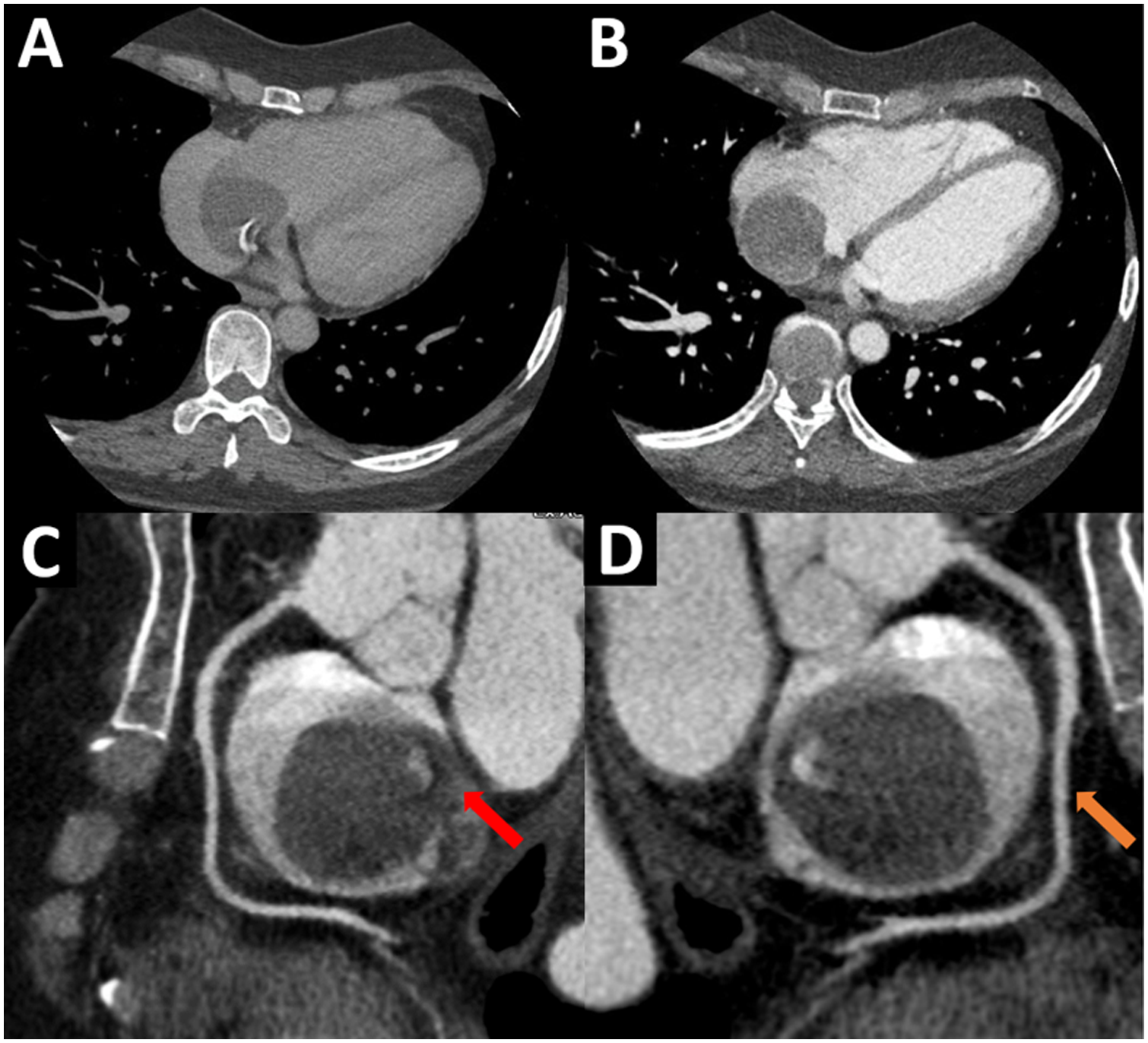 (A,B) ECG-gated CTA, four-chamber view. A mobile, round, homogenous mass is seen adhered to the right lower interatrial septum. (C,D) ECG-gated CTA, sagittal views of the right atrium. A homogeneous, non-contrast-enhancing mass with calcified areas and defined edges is seen in the right atrium. Note the 12 mm pedicle (red arrow) that attaches it to the interatrial septum, near the fossa ovalis. Likewise, the right coronary artery (orange arrow) is seen, which does not provide collateral to the mass. ECG, electrocardiogram; CTA, computed tomography angiography.