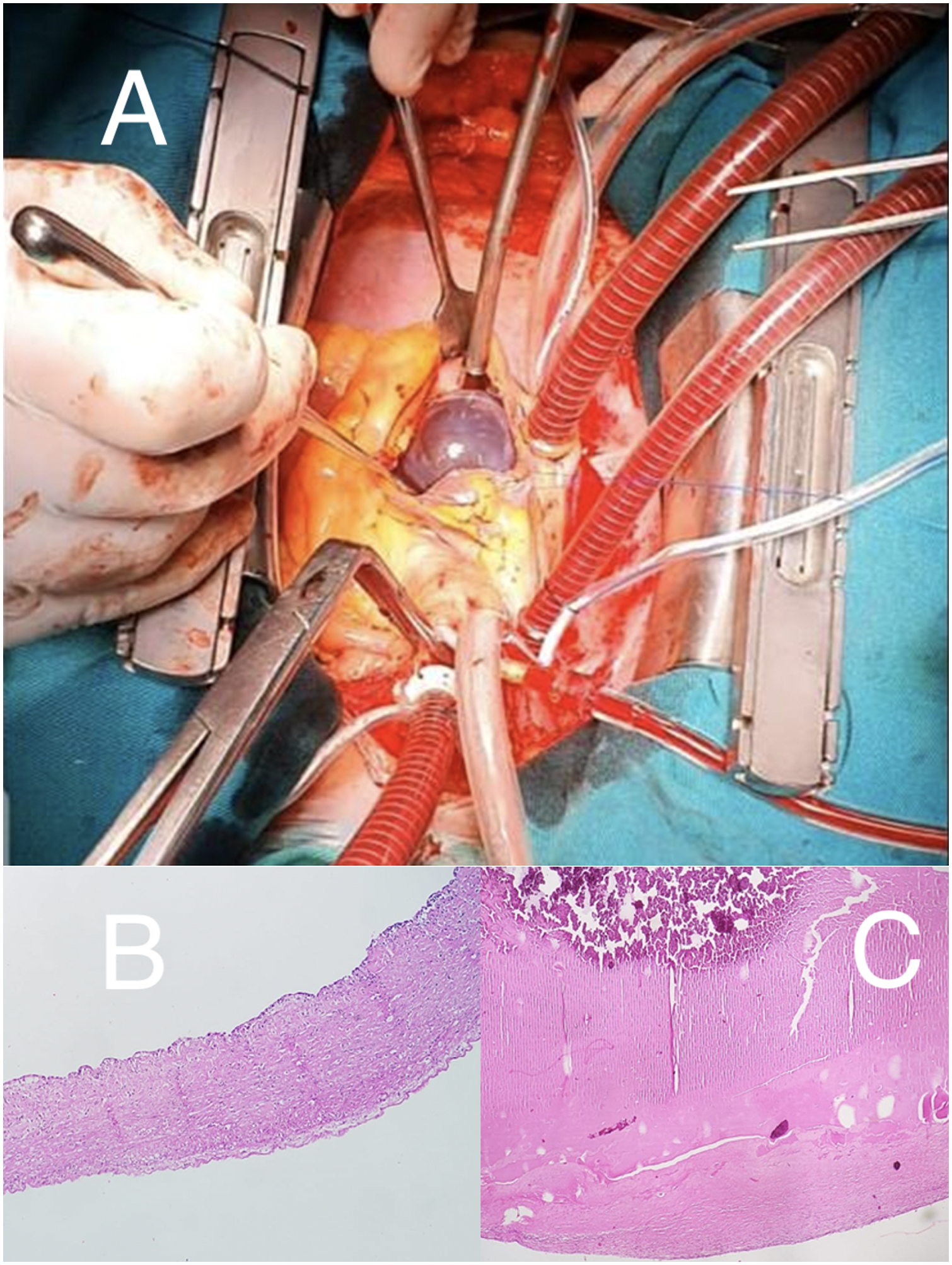 (A) Surgical field. Right atriotomy, with exposure of violaceous, smooth, and shiny mass. (B) Microscopy: fibrous (composed of collagenous layers) cyst wall without epithelial cells. Presence of some lymphocytes. (C) Microscopy: uniform fibrin content with calcification areas (upper region with more intense staining).