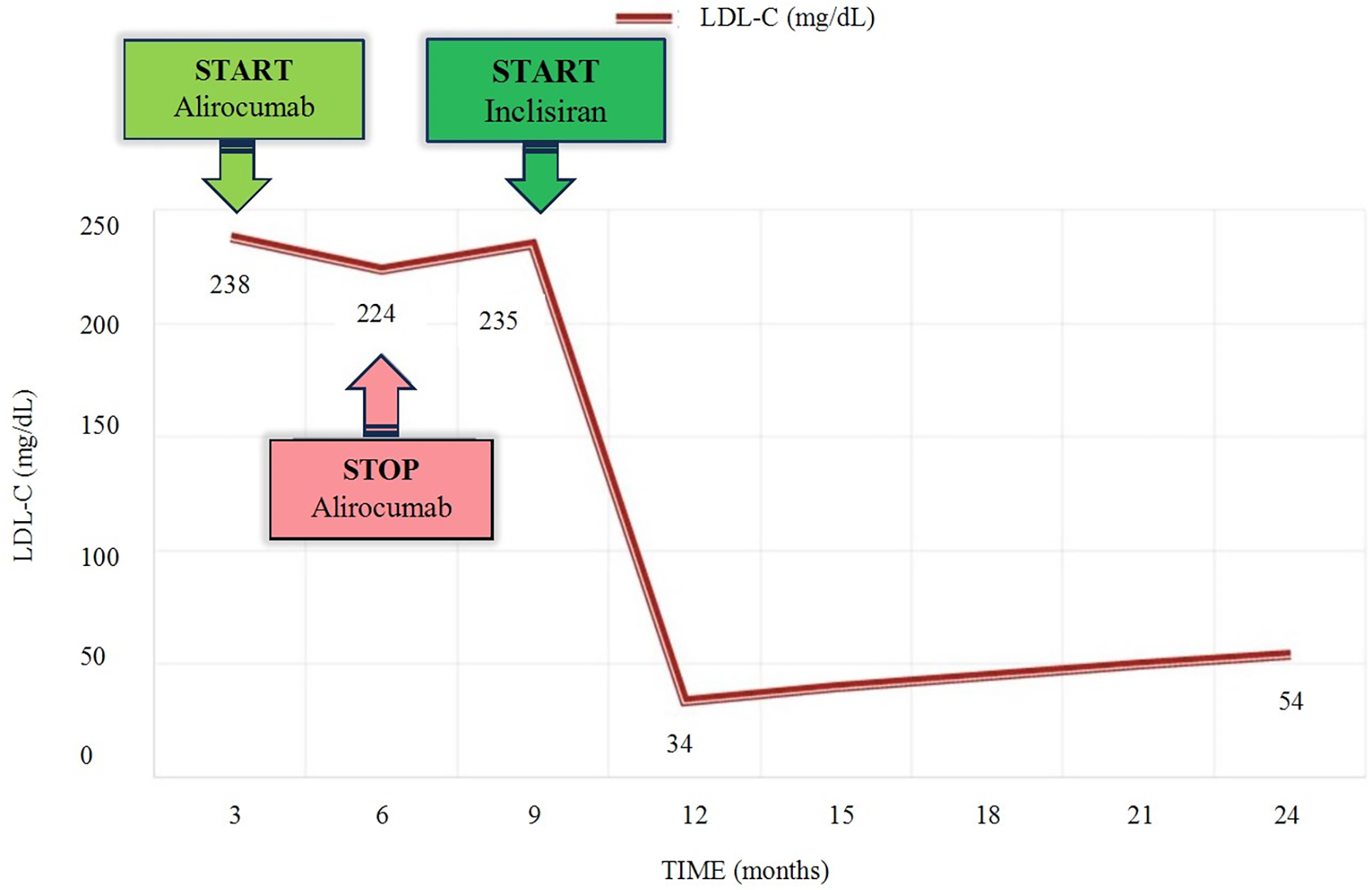 The patient had met the necessary criteria in the Polish FH treatment program to receive alirocumab, which was administered subcutaneously at a dose of 150 mg every 2 weeks. The woman underwent clinical evaluation and lab test follow-up after 3 months of treatment. Alirocumab was well-tolerated. No adverse effects were reported. The results of the laboratory tests showed that there was no significant decrease in LDL cholesterol. After unsuccessful treatment with a PCSK-9 inhibitor, the decision was made to begin administering inclisiran therapy. The patient was given 284 mg of inclisiran subcutaneously and follow-up tests were conducted after 3 months. The results showed a significant decrease in LDL cholesterol along with detailed lipid profile parameters: TC 114 mg/dL, non-HDL at 45 mg/dL, HDL-C at 69 mg/dL, TG at 53 mg/dL and LDL-C at 34 mg/dL. The next drug administration was scheduled in 6 months. Following a year of administering inslisiran, a noticeable positive therapeutic effect with LDL-C 54 mg/dL has been consistently observed and maintained. Individual LDL-C values over time are illustrated in Figure 1.