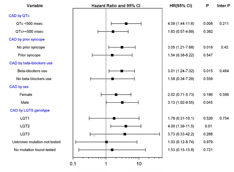 CAD vs. no CAD and risk of life threatening cardiac events in subgroups of patients. CAD, coronary artery disease; LQTS, long QT syndrome. Tests of interactions were performed using a single interaction term, except for the model investigating CAD by LQTS genotype using 4 interaction terms.