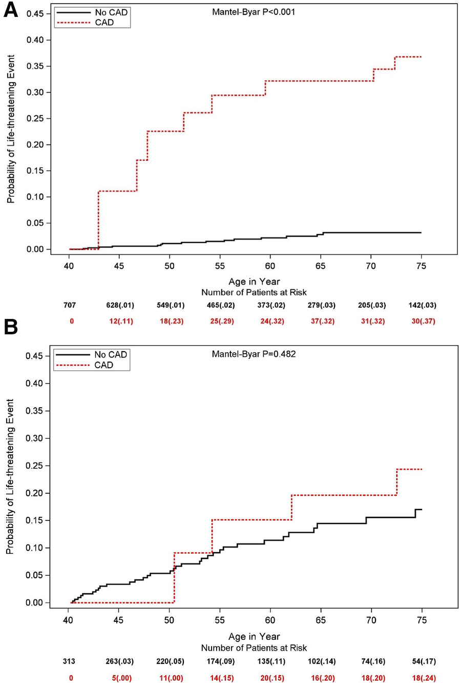 Figure 1 presents the Simon and Makuch estimates for LTEs by time-dependent CAD. The cumulative probability of LTE at age 75 was significantly higher in CAD patients (35%) than among no-CAD patients (7%, Mantle-Byar p < 0.001).