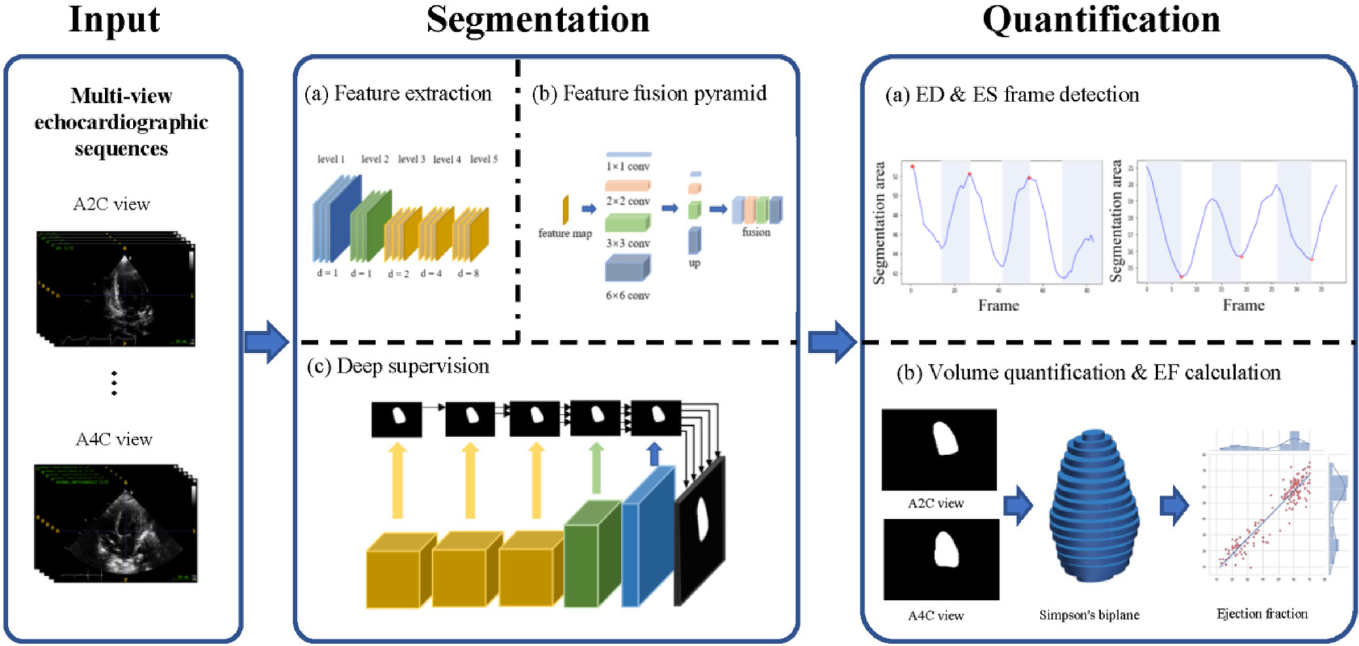 Overview of the PEQ-Net workflow. In the input part, we use two echocardiographic views, A2C and A4C. The two views echocardiographic sequences are segmented and quantified at the same time by a unified model. The segmentation part is divided into three stages: (a) Feature extraction, (b) Feature fusion pyramid, (c) Deep supervision. This part outputs a frame-by-frame segmentation of the echocardiographic sequence. In the quantification part, ED frames and ES frames are obtained based on the detection of the peak area of each frame in the sequence. Then, we use Simpson's biplane method for volume quantification. Further ED and ES volumes and ejection fractions can be obtained for each case.