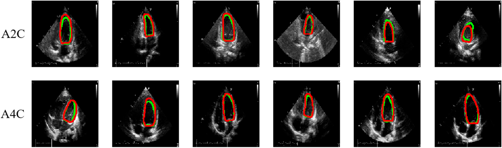Quantitative results of PEQ-Net in LV segmentation. The red and green contour lines represent the ground truth and predicted masks in segmentation, respectively.