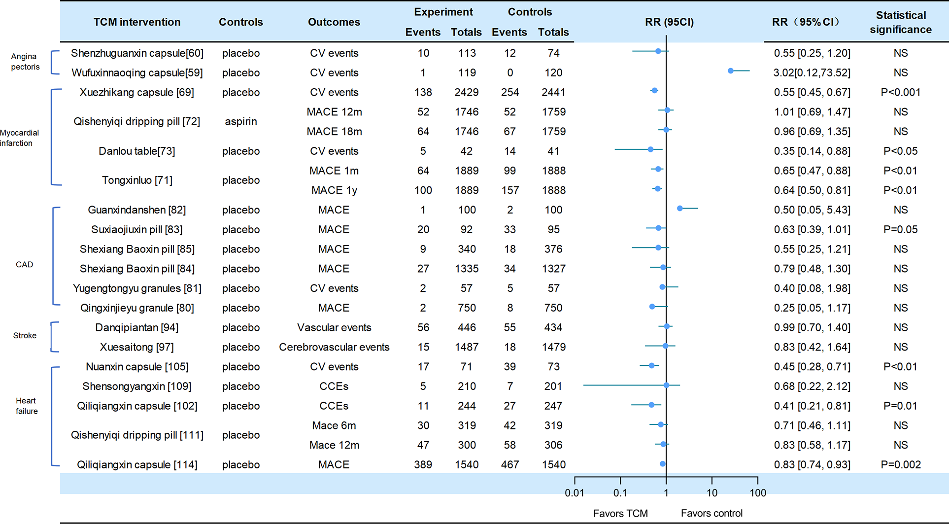 Cv events in traditional Chinese medicine interventions for CVD. Numbers in parentheses=reference numbers. CV, cardiovascular; CVD, cardiovascular disease; TCM, traditional Chinese medicine; NS, not significant; RR, risk ratio.