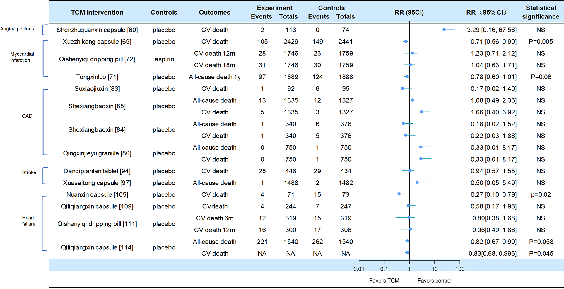Death events in traditional Chinese medicine interventions for CVD. Numbers in parentheses=reference numbers. CV, cardiovascular; CVD, cardiovascular disease; TCM, traditional Chinese medicine; NS, not significant; RR, risk ratio.