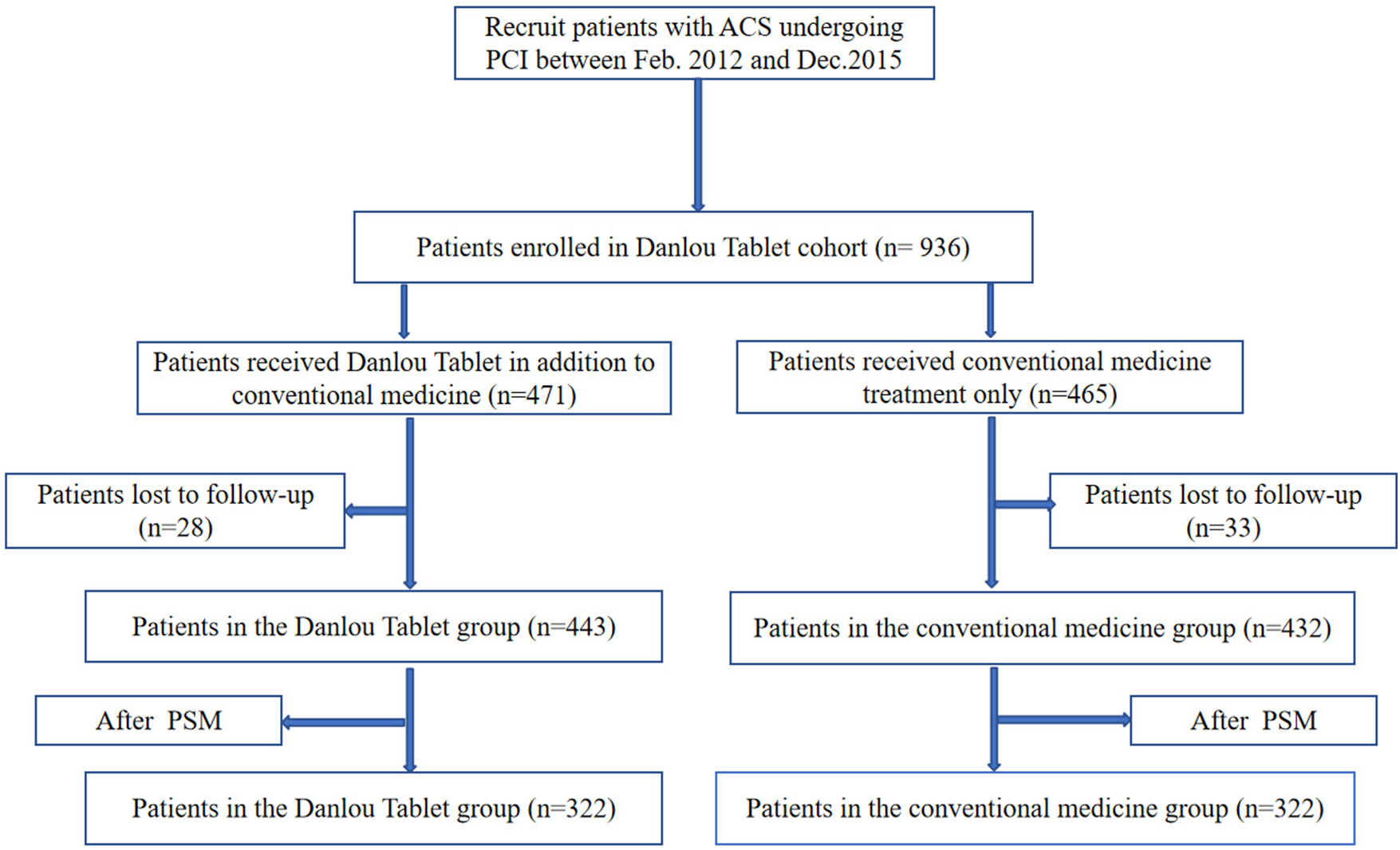 Chinese medicine has gained increasing recognition worldwide owing to its multi-target and multi-level functional characteristics. For many years, China authorized the use of the patented Chinese medication Danlou tablet (DLT) for thetreatment of coronary heart disease (CHD). DLT is composed of 10 kinds of Chinese herbs: Trichosantheskirilowii, Allium macrostemon, Pueraria montana var. lobata, Conioselinumanthriscoides, Salvia miltiorrhiza, Paeonia anomala subsp. Veitchii, Alisma plantago-aquatica subsp. Orientale, Astragalus mongholicus, Drynariaroosii, and Curcuma aromatica (6). Previous research has demonstrated that DLT protects the heart against remodeling and dysfunction during myocardial ischemia/reperfusion injury in rats by stimulating the AKT/FoxO3a pathway (7). A clinical study has found that DLT reduces the risk of cardiovascular events in patients with non-ST-segment elevation acute coronary syndromes (NSTE-ACS) undergoing PCI (8). According to a meta-analysis of 17 randomized controlled trials, combining DLT with conventional medicine (CM) can reduce the frequency and duration of angina pectoris, demonstrating positive efficacy and safety (9). However, whether DLT combined with CM can reduce the risk of cardiovascular events in ACS patients undergoing PCI remains to be fully investigated. Therefore, we conducted a multicenter prospective cohort study to investigate the effect of DLT in combination with CM on cardiovascular endpoint in patients with ACS undergoing PCI.