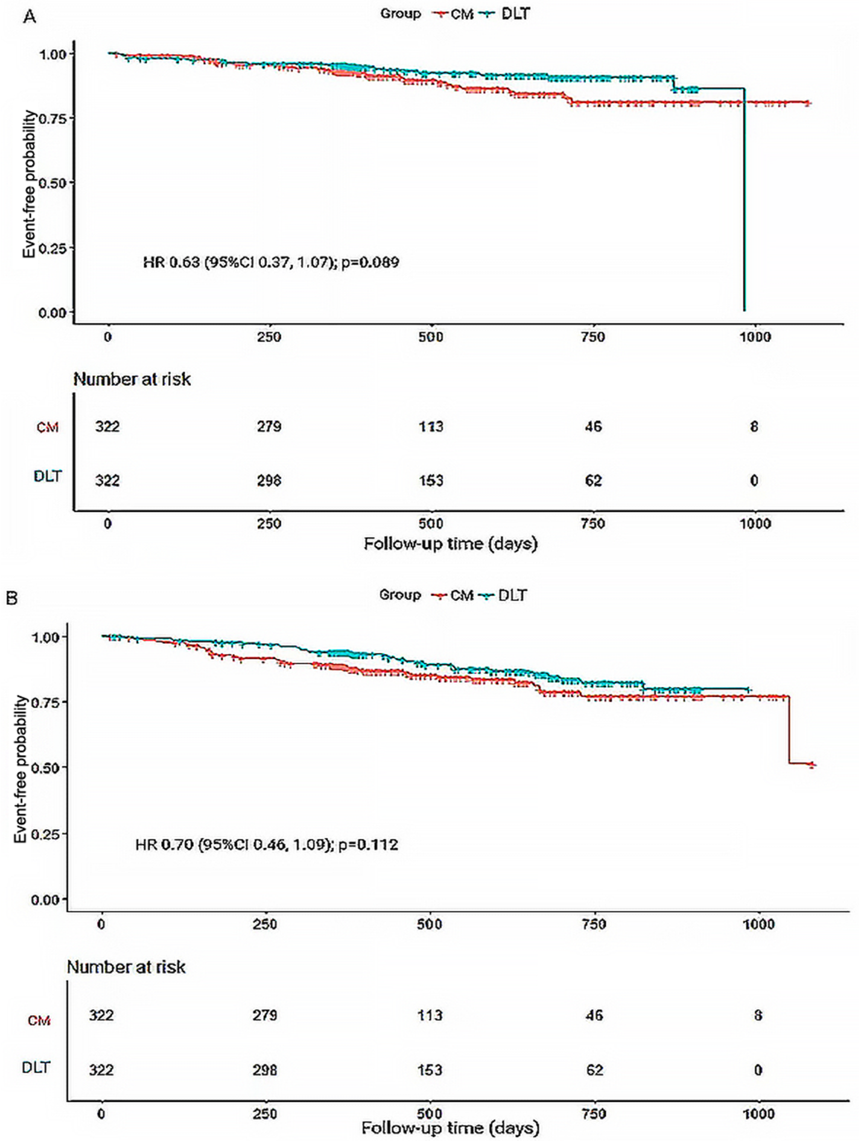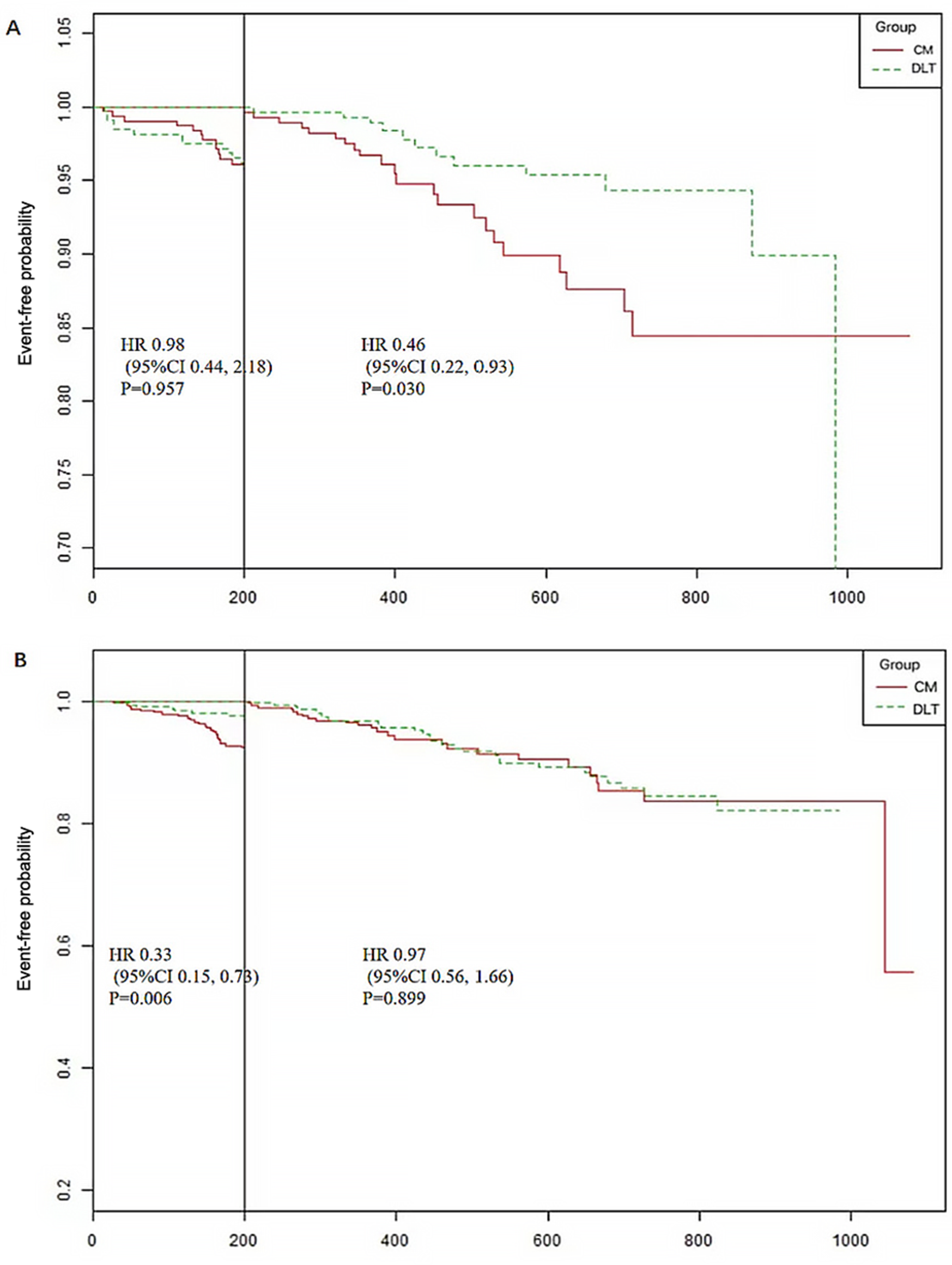 A total of 44 patients (10.19%) in the CM group and 35 (7.90%) in the DLT group reached the primary endpoint during the 3-year follow-up. The risk of the primary endpoint did not differ significantly between DLT and CM groups after adjusting for confounders using Cox proportional hazards models (hazard ratio [HR] 0.68, 95% confidence interval [CI] 0.42–1.12, P = 0.134), in accordance with the analysis after PSM (HR 0.63, 95% CI 0.37–1.07, P = 0.089) (Table 2). However, landmark analysis showed meaningful benefit for the primary endpoint in the DLT group after 200 days (HR 0.46, 95% CI 0.22–0.93, P = 0.030) (Table 3). The survival curves for the 3-year primary endpoint after PSM are presented in Figure 2A. Landmark analysis of the primary endpoint in the PSM cohort is depicted in Figure 3A.