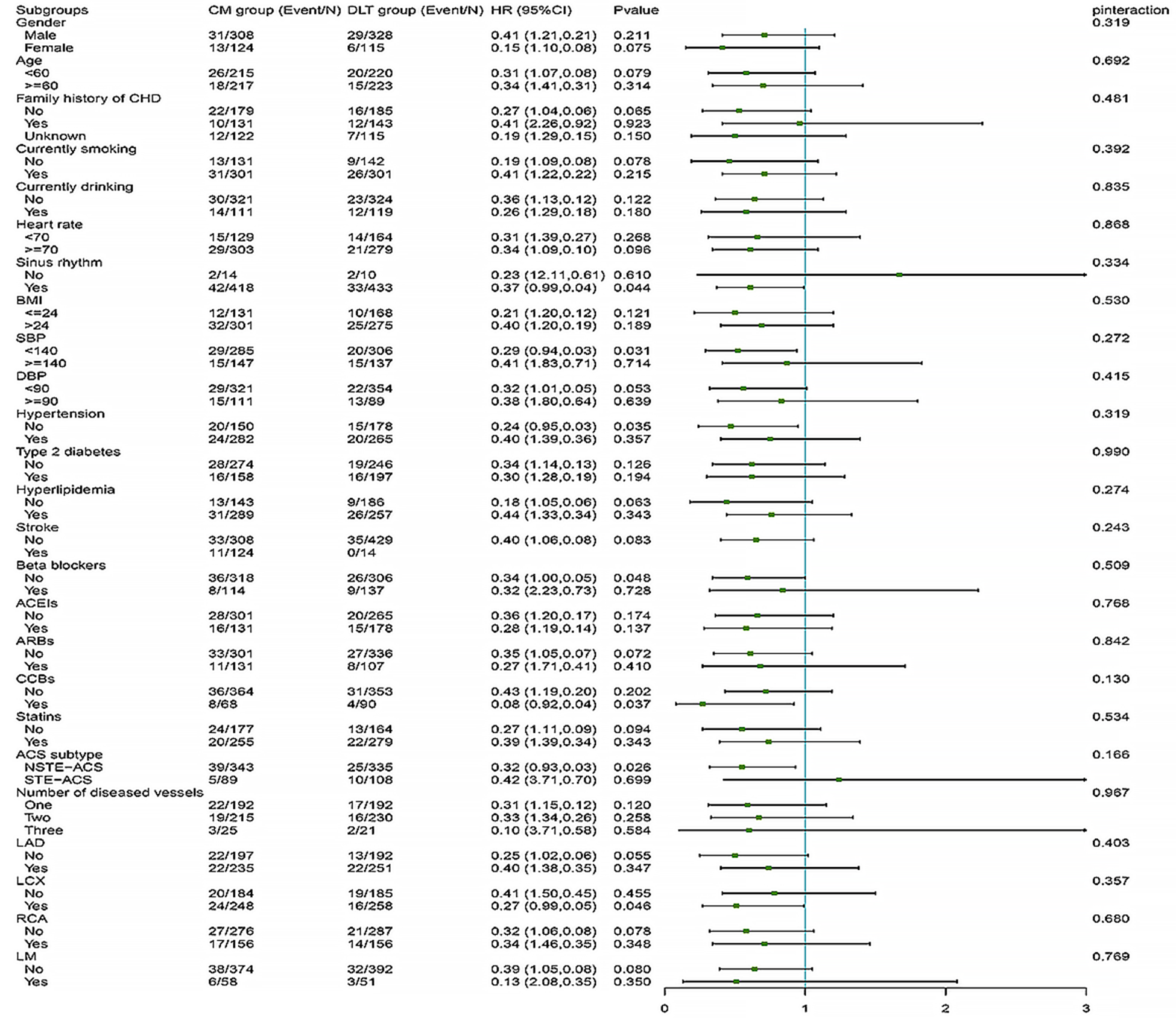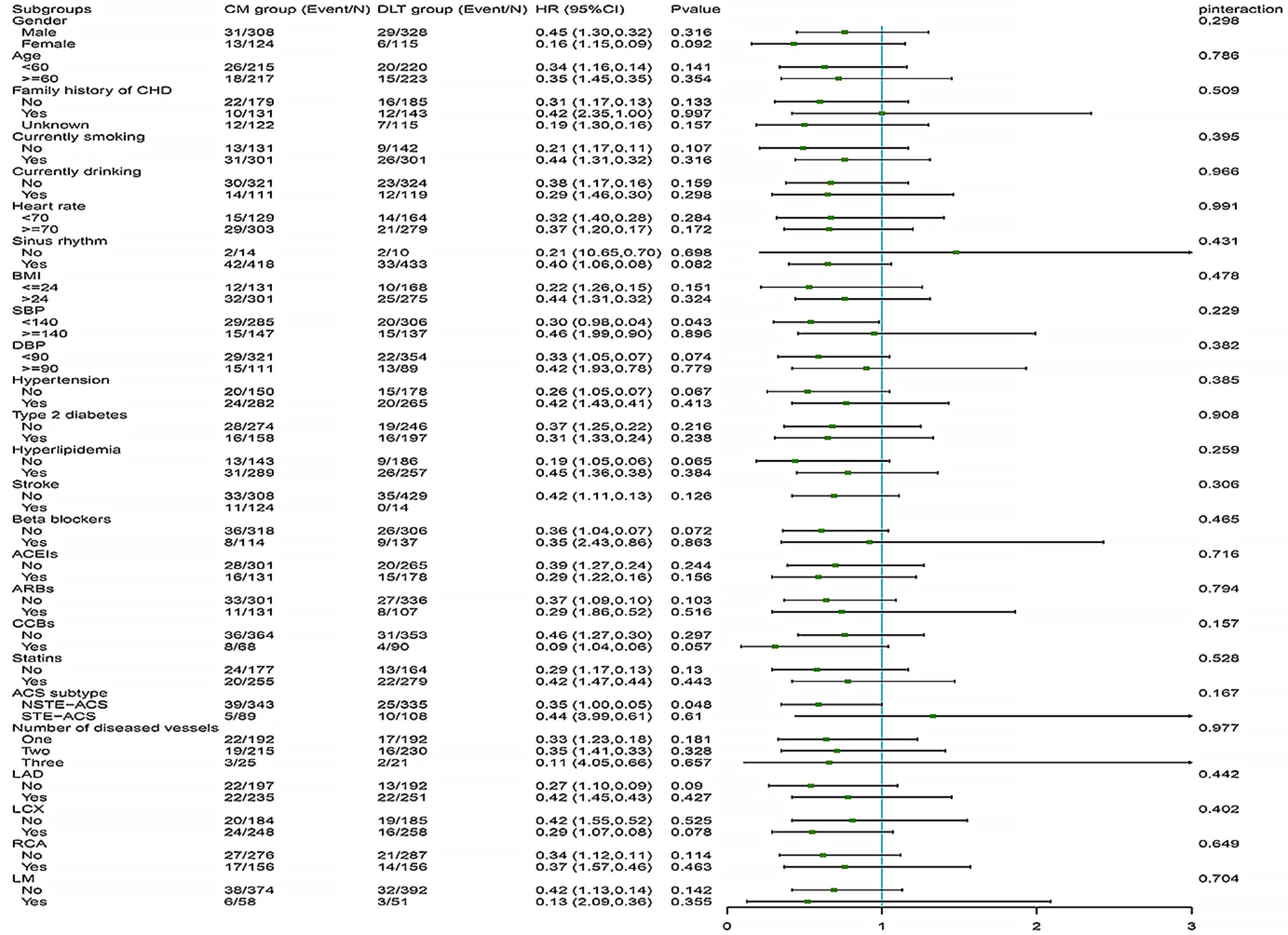 Patients in this cohort were divided into the DLT and the CM groups based on their use of DLT prior to enrollment. The DLT group received DLT (1.5 g, three times daily for 12 months) alongside CM treatment. Baseline characteristics of patients in both groups were recorded, encompassing gender, age, family history, heart rate, blood pressure, comorbidities, concomitant medications, number of diseased vessels, and subtype of ACS.