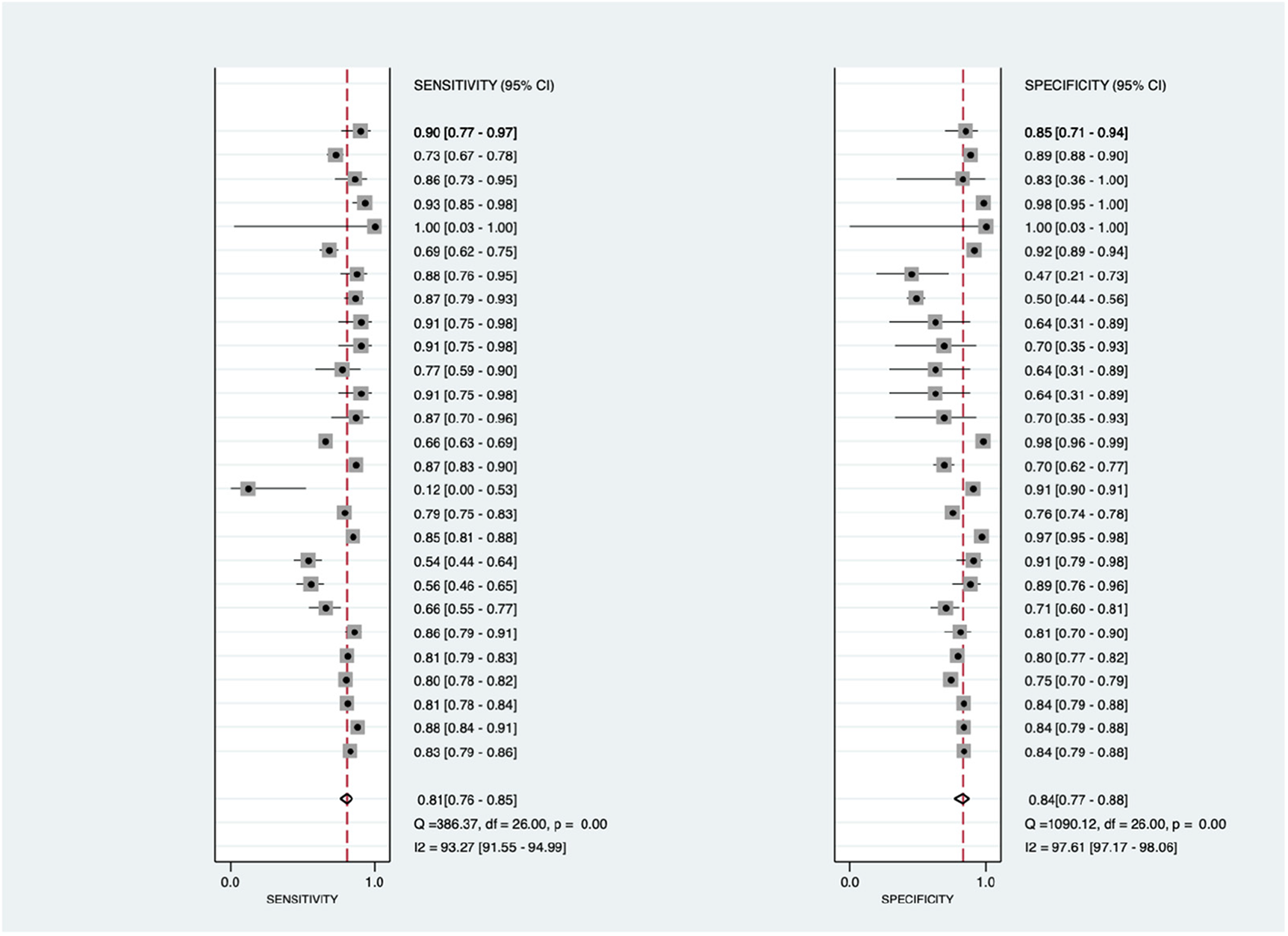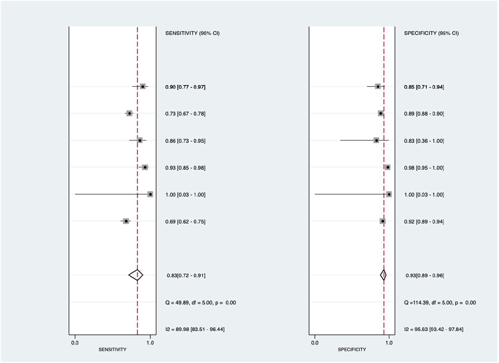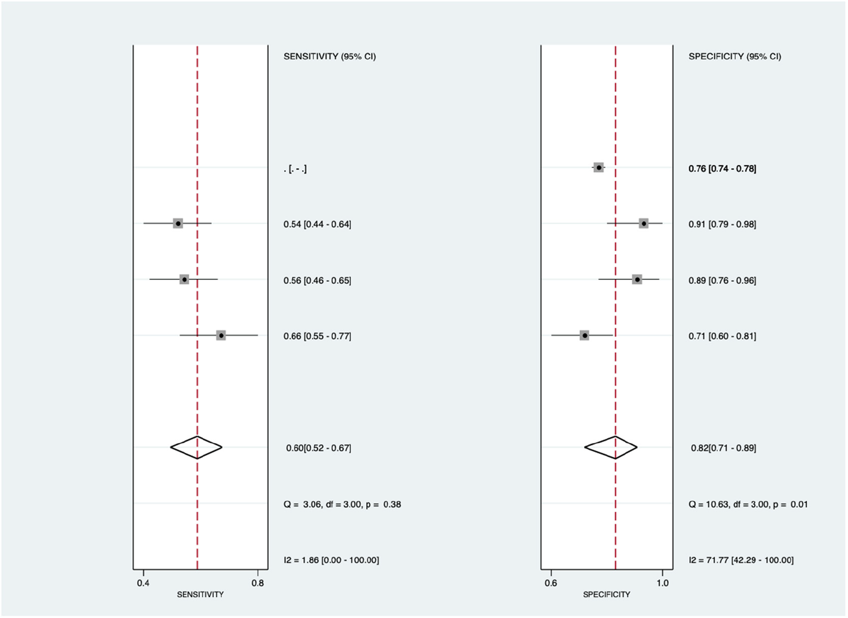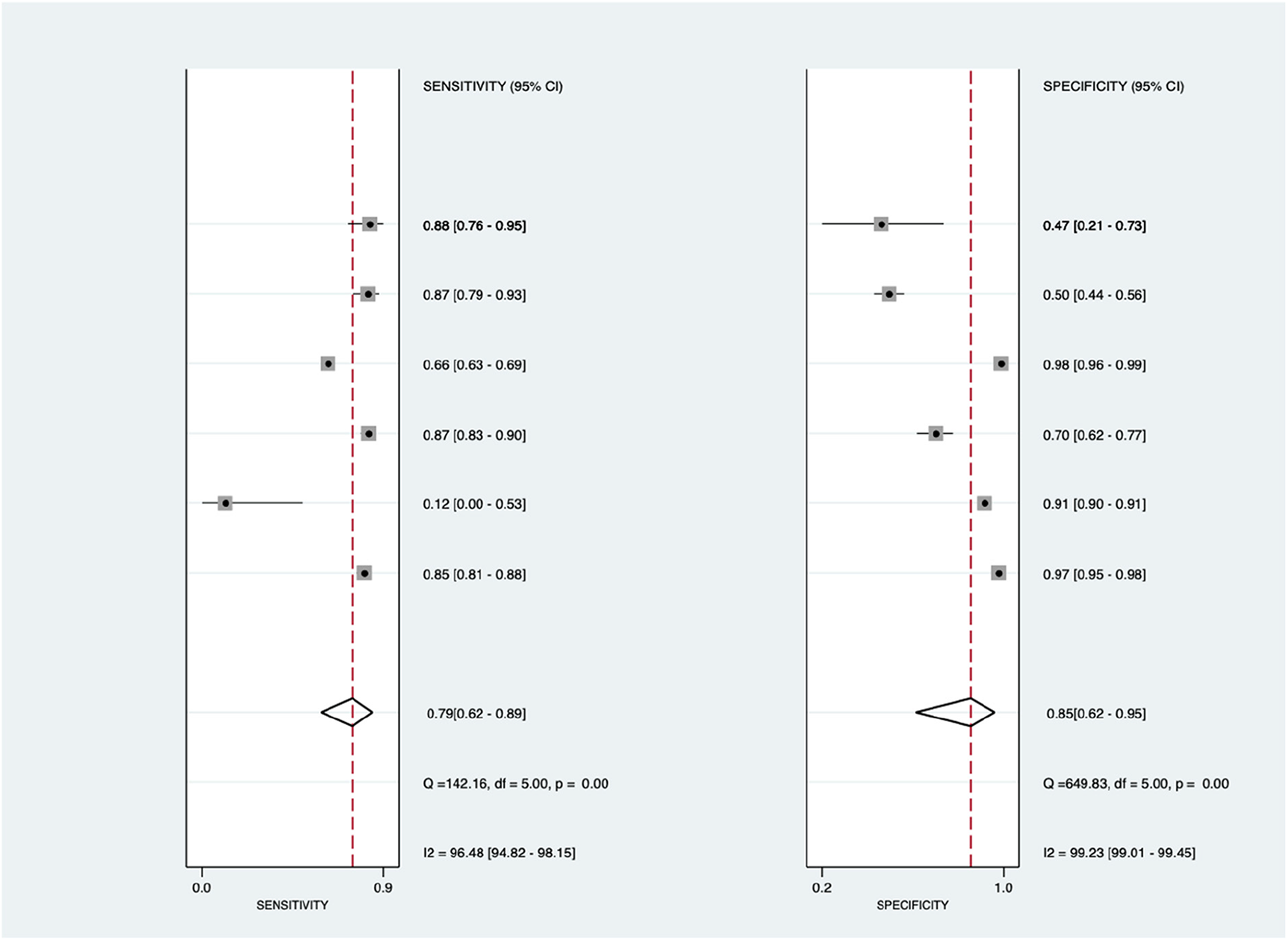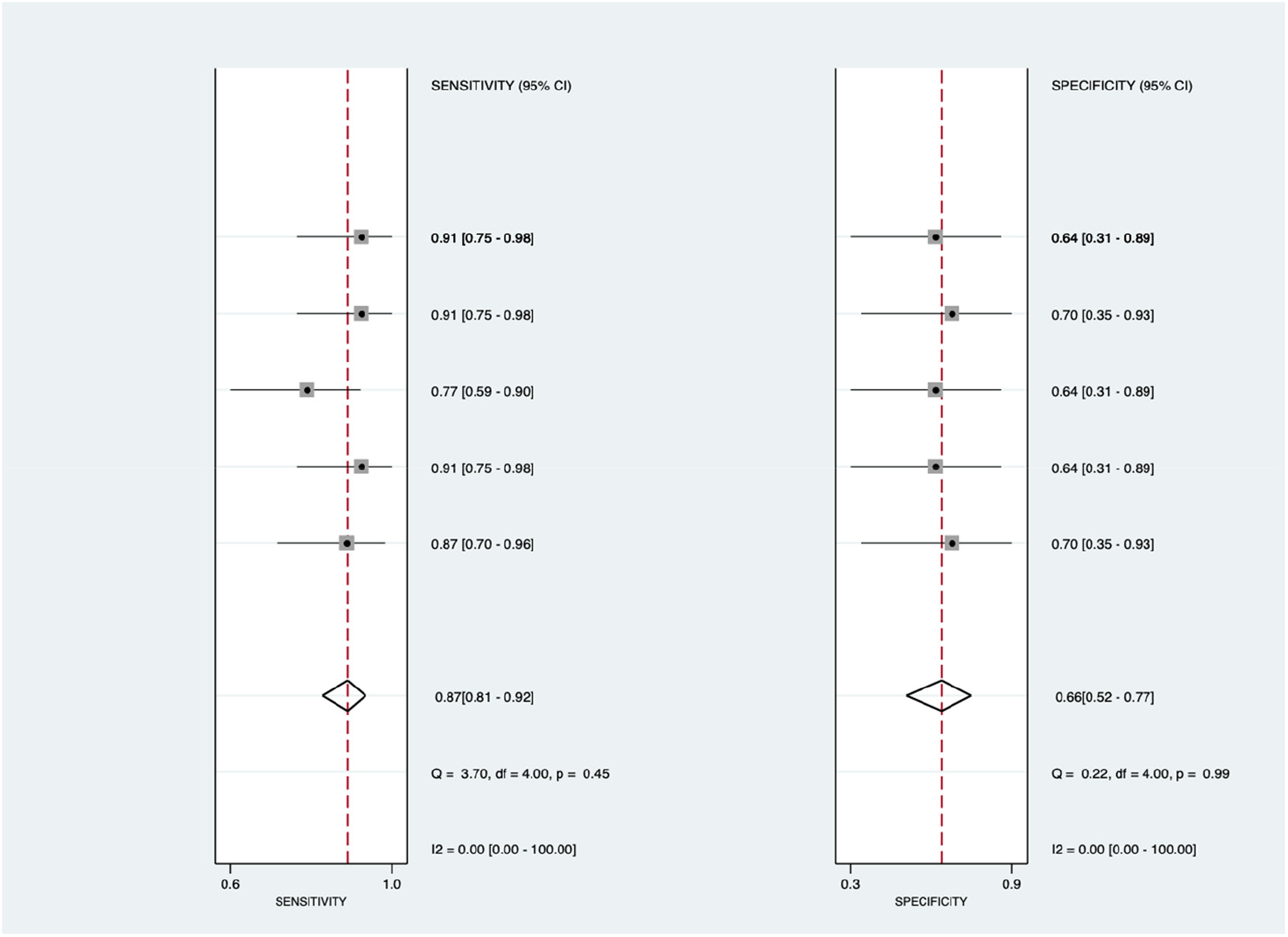 Figure 3. Forest plot showing overall sensitivity (left forest plot) and specificity (right forest plot) with corresponding heterogeneity statistics. The gray square and solid lines represent the odds ratio with 95% confidence intervals. The rhombus indicates the pooled estimate with 95% confidence intervals.