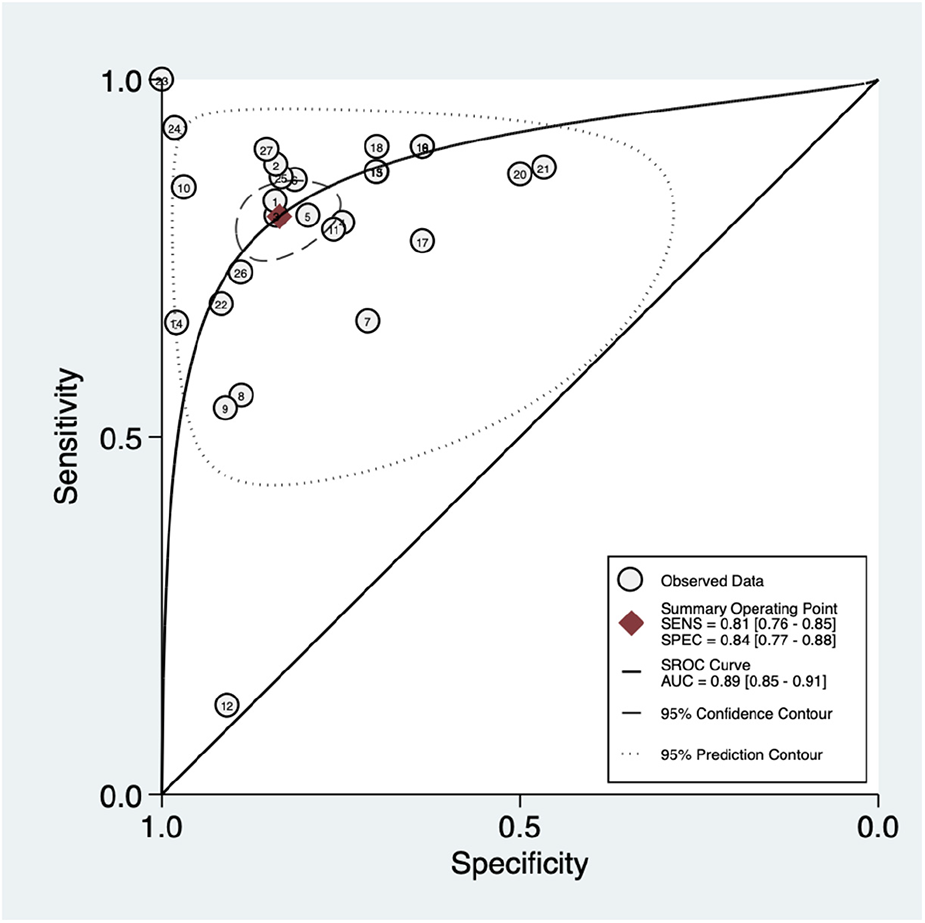 Figure 4. Summary ROC curve with confidence and prediction regions around mean operating sensitivity and specificity point.