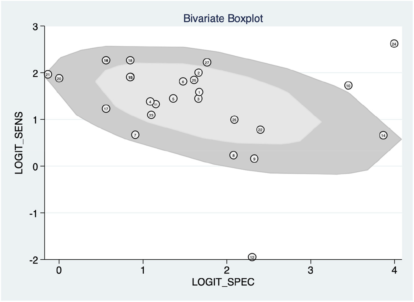 Figure 5 shows the construction of a bivariate boxplot, which is a useful tool for detecting heterogeneity in each study. One study did not occur in the boxplot, including study 13 meanwhile three studies presented as outliers, including studies 10 (22), 12 (13), and 24 (12). Study 12 (23) involved patients with PAH and other subtypes of PH, study 10 involved the use of Chest x-ray, study 24 involved the use of ECG, meanwhile, study 12 involved the use of clinical code. This implies that the type of diagnostic method conducted prior to the machine learning algorithm could be the main cause of heterogeneity.