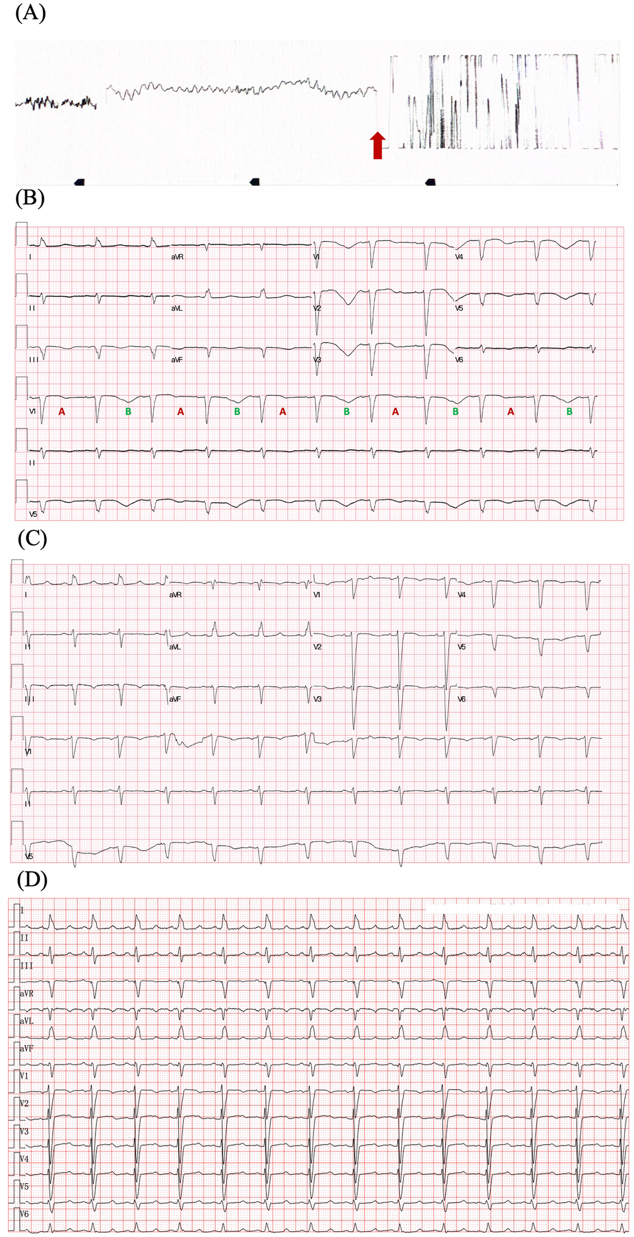 ECGs of the patient. (A) ECG illustrating ventricular fibrillation and defibrillation (red arrow). (B) ECG after defibrillation displays sinus rhythm, QTc prolongation (655 ms), and T wave alternans. The distinct beat-to-beat alternation of the T-wave structure with a repeating ABABAB pattern is observed in lead V1. (C) ECG before discharge displays QTc 509 ms and improved T-wave morphology. (D) ECG after 6 months follow-up displays QTc 490 ms. Heart rate correction of QT interval was performed by Bazett's formula. ECG, electrocardiography.