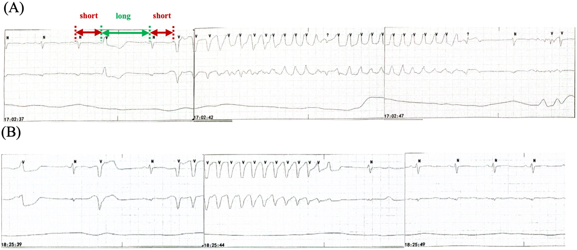 Recurrent TdP. (A) TdP with a “short-long-short” pattern of R-R cycles (red and green arrows) before intravenous ISO administration. (B) TdP recurrence when the HR decreases to the baseline level after terminating ISO. TdP disappears for 90 min with HR >60 bpm because of the use of ISO. HR, heart rate; ISO, isoproterenol; TdP, Torsade de Pointes.