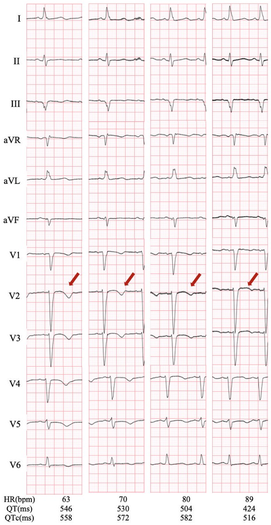 ECG during intravenous ISO administration. Shortness of QTc from 558 ms to 519 ms with HR from 63 bpm to 89 bpm is observed, along with improved T wave morphology in the precordial leads from inversion to upright (red arrow). ISO, isoproterenol; ECG, electrocardiography.