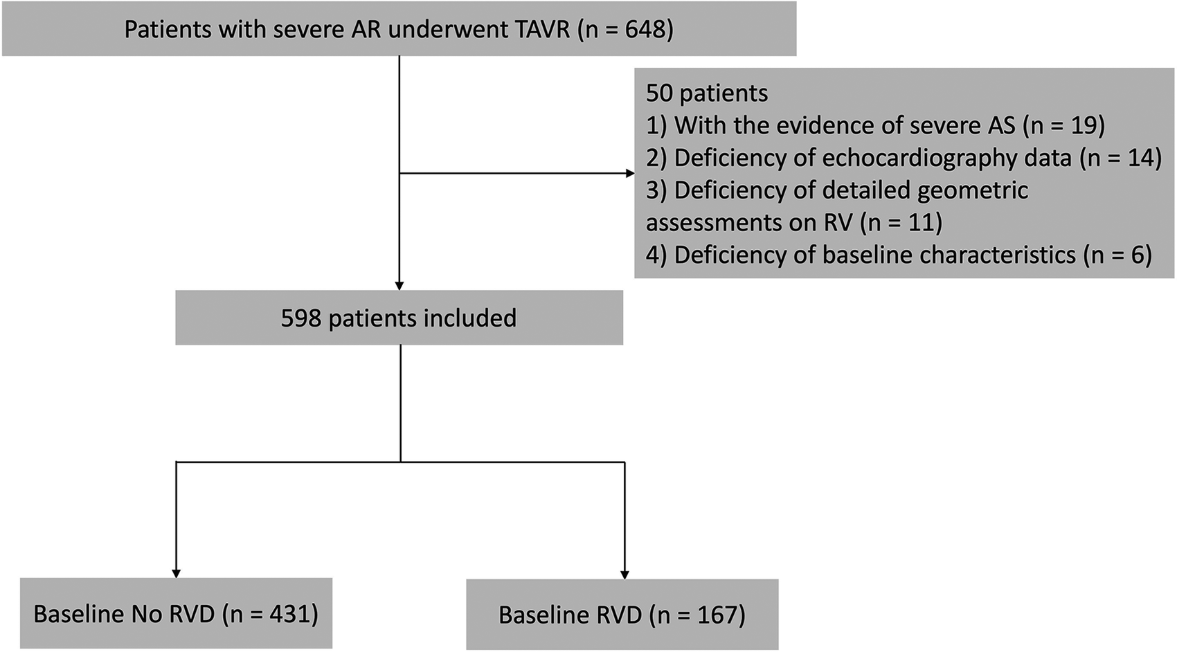 In recent years, transcatheter aortic valve replacement (TAVR) has led to significant progress in the treatment of severe aortic stenosis (5, 6). Although some studies have preliminarily confirmed that TAVR can achieve significant outcomes in the treatment of pure AR, the optimal timing is still unclear (7). At present, the indications for patients with AR for TAVR are based mainly on symptoms, on left ventricular function and on the degree of dilation observed using echocardiography (2, 3). Therefore, identifying characteristics that predict adverse events is important for risk stratification and may help guide management decisions. Previously, it was recognized that right ventricular dysfunction (RVD) is correlated with adverse events of valvular heart disease that occur postoperatively (8, 9). Long-term AR may lead to chronic pressure and increased volume load, which in turn induces RVD (8). However, understanding of the influence of RVD on the clinical outcomes of TAVR in patients with pure AR is limited (7). The changes in right ventricular (RV) function pre- and post-TAVR have not been explored. In this context, the purpose of this study was to evaluate the clinical implications and prognostic value of RVD after TAVR in patients with pure AR.