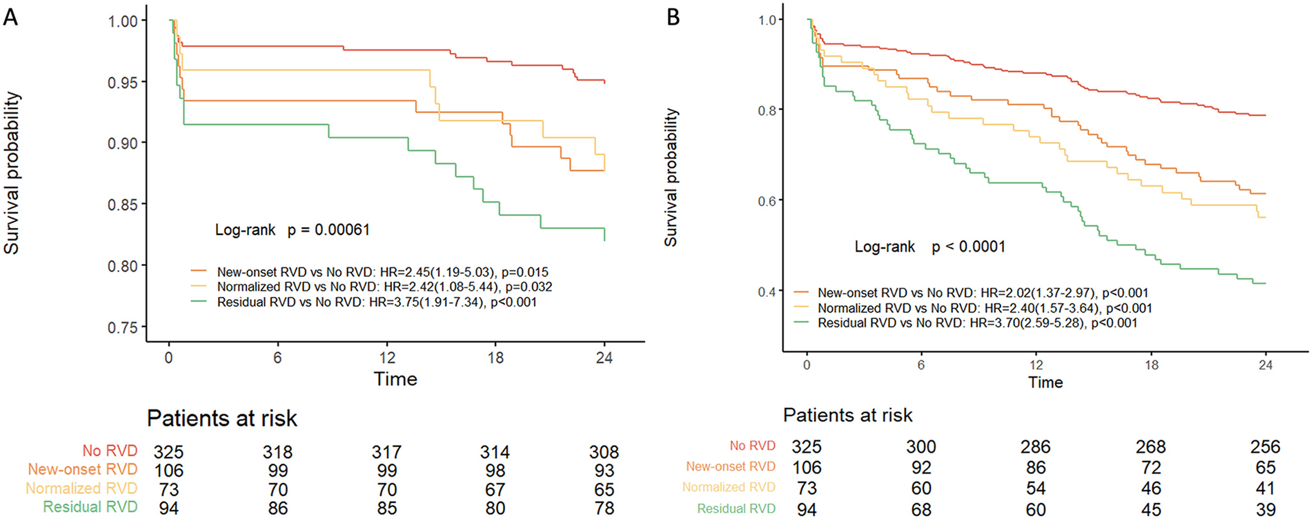A total of 648 patients were divided into four groups: 325 patients (54.3%) in the no RVD group; 106 patients (17.7%) in the new-onset RVD group; 73 patients (12.2%) in the normalized RVD group; and 94 patients (15.7%) in the residual RVD group. At the 2-year follow-up, there were significant differences in all-cause mortality among the four groups (5.2%, 12.3%, 11.0% and 17.0%, respectively; p < 0.05). New-onset RVD was correlated with an increased risk of all-cause death and a composite end point and normalized RVD improved clinical outcomes of baseline RVD. Predictors of new-onset RVD included a higher Society of Thoracic Surgeons score, larger left ventricular end-diastolic volume, lower left ventricular ejection fraction, higher systolic pulmonary artery pressure and smaller RV base diameter.