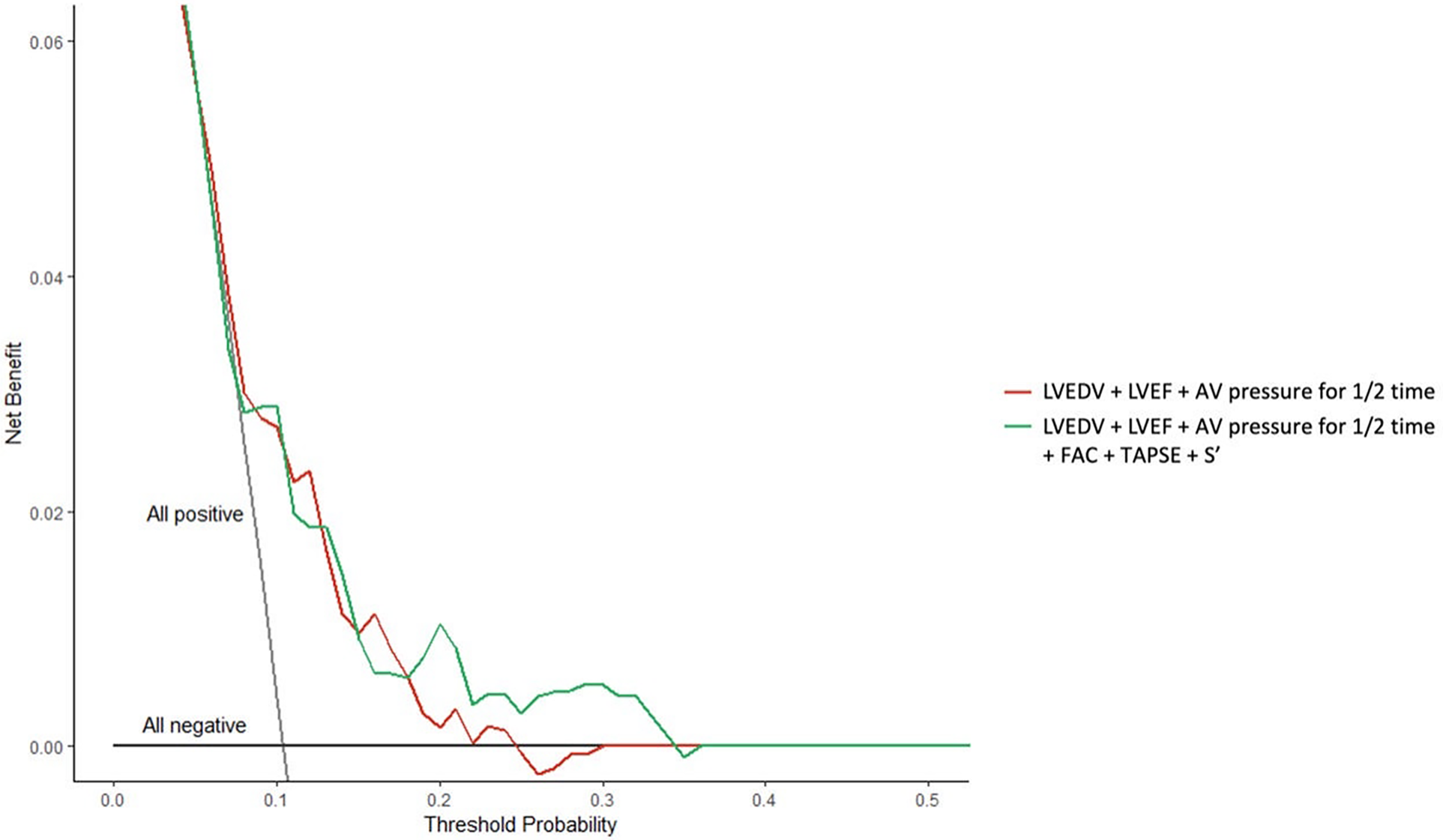 All data were tested for normality and homogeneity of variance. Continuous variables were expressed as mean ± standard deviation or median and interquartile ranges (IQR). The results of the categorical data were expressed as n (%). Patients were classified according to RV function status. Normal distribution of continuous and non-normal variables was compared using Bonferroni's analysis of variance test and the Mann–Whitney U test, respectively, and the χ2 test or the Fisher exact test, if appropriate. Univariate and multivariate logistic regression models (entered when the univariate p value < 0.05) was used to derive factors associated with residual RVD and new-onset RVD. We used pre-TAVR RVD as a binary variable and pre-TAVR FAC, TAPSE and S’ as continuous variables, respectively. Residual RVD was compared with normalized RVD, whereas new-onset RVD was compared with no RVD. Cox regression models were used to derive the hazard ratio (HR) (entered when the univariate p value < 0.05) and 95% confidence intervals (CI) for clinical, laboratory and echocardiographic factors associated with adverse events. The HRs were calculated in univariate and multivariate Cox regressions to assess the correlations of FAC, TAPSE and S’ with study outcomes. In addition to guideline-based procedural indications as a decision tool, decision curve analysis was used to estimate the net benefit of RV evaluation (17). Kaplan-Meier curves were used to determine the 2-year cumulative incidence of all-cause mortality and the composite end point. Bilateral p values < 0.05 were considered statistically significant. Statistical analyses were performed using R programming language version 4.2.2 (R Foundation for Statistical Computing, Vienna, Austria).