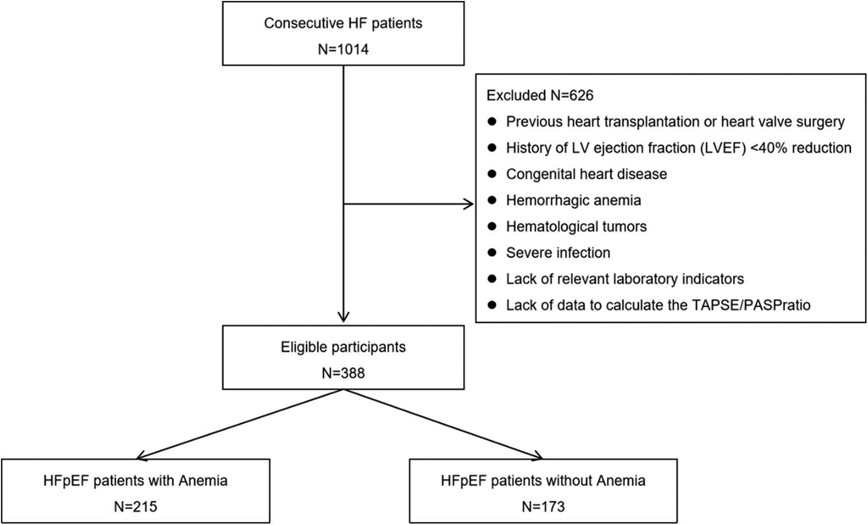 We retrospectively analyzed consecutive 1,014 HF patients in the Department of Cardiovascular Medicine, Chongqing Hospital of Traditional Chinese Medicine from August 1, 2018 to October 1, 2020. The inclusion criteria were as follows: history, signs, symptoms, and treatment for HFpEF. Patients with HFpEF were selected according to the Chinese Guidelines for the diagnosis and treatment of Heart Failure 2018 (17). The diagnostic criteria for HFpEF are as follows: (1) presence of HF as defined by Framingham criteria, (2) left ventricular ejection fraction ≥50%, (3) NT-proBNP >125 pg/ml, and (3) transthoracic echocardiography meets at least one of the following diagnostic criteria (1) left ventricular hypertrophy and/or left atrial enlargement, and (2) ratio of early diastolic mitral inflow velocity (E) to early diastolic mitral annulus velocity (e') ≥ 13 and/or mean value of e' (interventricular septum and left ventricular lateral wall) <9 cm/s. Exclusion criteria were: previous heart transplantation or heart valve surgery, history of LV ejection fraction (LVEF) <40% reduction, congenital heart disease, acute or chronic hemorrhagic anemia, hematological tumors, severe infection, lack of relevant laboratory indicators, or lack of data to calculate the tricuspid annular plane systolic excursion (TAPSE)/pulmonary arterial systolic pressure (PASP) ratio. Thus, the final cohort included 388 HFpEF patients (Figure 1). Patients were divided into anemia and no anemia groups based on whether their Hb levels met the WHO anemia thresholds (i.e., male Hb <13.0 g/dl, female Hb <12.0 g/dl). The severity of anemia was classified according to Practical Internal Medicine, with mild anemia defined as an Hb level lower than normal but greater than 9.0 g/dl, moderate anemia defined as between 6.1 and 9.0 g/dl, and severe anemia defined as less than 6.1 g/dl (18). The study conformed to the principles outlined in the Declaration of Helsinki and was approved by the Institutional Review Board of Chongqing Traditional Chinese Medicine Hospital (Approval No. 2022-KY-KS-WJ) as posing minimal risk to patients, and was performed under a waiver of informed consent.