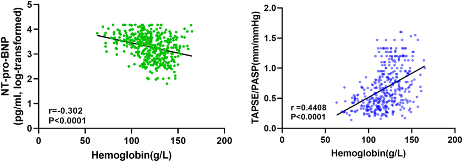 The study showed that anemic patients were older and had significantly higher New York Heart Association functional class and tricuspid regurgitation (TR) than non-anemic patients. The level of hemoglobin (Hb) had a weak negative linear correlation with NT-pro-BNP (log-transform, r = 0.30, P < 0.0001) and a positively correlation with the tricuspid annular plane systolic excursion (TAPSE)/pulmonary arterial systolic pressure (PASP) ratio (r = 0.44, P < 0.0001). Multivariate linear regression analysis shows that the degree of anemia, atrial fibrillation, and TR were independently associated with the TAPSE/PASP ratio.