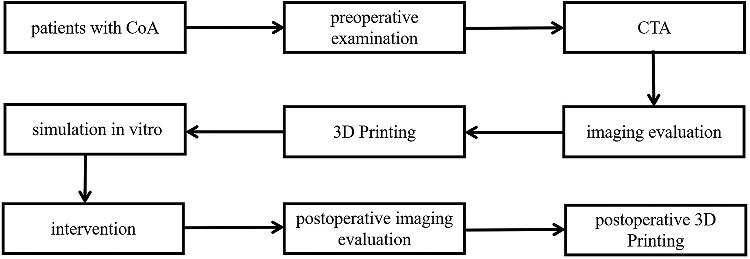 A total of 10 patients with CoA underwent percutaneous balloon expandable covered stent implantation in Cardiovascular Surgery, Xijing Hospital from December 2018 to December 2023 were enrolled. Among them, there were 6 males and 4 females whose average age was (27.68 ± 13.45) years. Routine arterial blood pressure measurements showed that patients had different degrees of hypertension (right upper limb), and lower limb blood pressure was generally lower than upper limb blood pressure by 20 mmHg or more. There were 2 cases with ventricular septal defect and 2 cases with patent ductus arteriosus. All patients underwent percutaneous human-to-human occlusion at the same time. One case had mild aortic insufficiency. Preoperative ECG, echocardiography and aortic CTA were performed to confirm the clinical diagnosis. Routine preoperative biochemical examinations were performed to assess the patient's condition. All patients were diagnosed with CoA for the first time and none undergo plain angioplasty before stent placement. All selected patients have obtained the informed consent of their patients and their families, and signed the informed consent form for surgery (Figure 1).