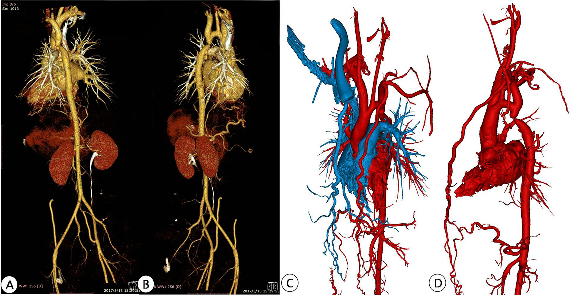At least 3 months after the operation, the patient persisted in taking dual antiplatelet aggregation drugs orally. After 3, 6, 12 months to the hospital for review, 1 year after the annual outpatient follow-up. Ask patients about the improvement of general symptoms, measure the blood pressure of limbs, and review the color echocardiography, aortic CTA and 3D printing if necessary.