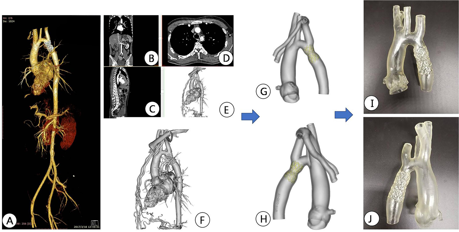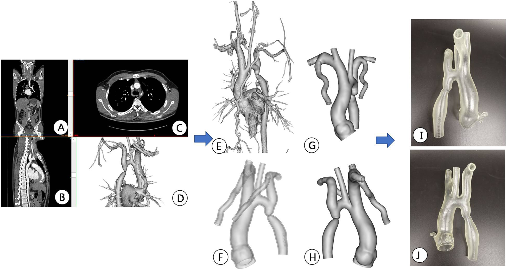 CT image reconstruction and 3D printing model after aortic coarctation surgery. (A) Postoperative aortic CTA reconstruction imaging showed stent position; (B–D) CTA images were imported into Mimics software and displayed different sections; (E,F) reconstruction images after stent implantation; (G,H) reconstructed images were segmented and modified for subsequent 3D printing; (I,J) 3D printed models after stent implantation.
