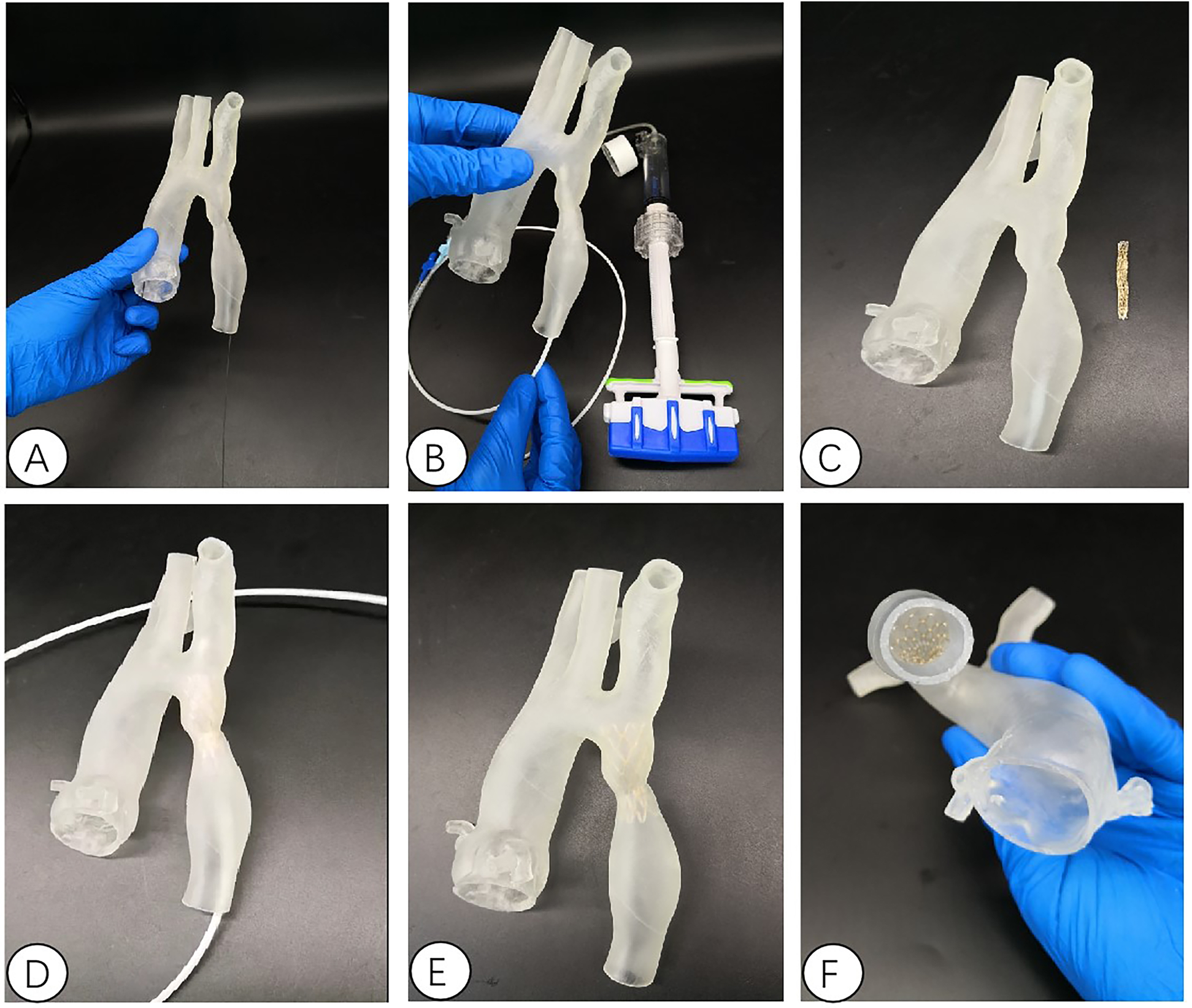 Interventional simulation using 3D printed models. (A) 3D printed aortic constriction model; (B) Using a 3D printing model of aortic constriction to simulate balloon dilation in vitro; (C) 3D printed aortic constriction model and stent with covered membrane; (D)in vitro simulated stent release at aortic constriction; The position relationship and fit degree between the (E,F) bracket and the 3D printed model after its release.