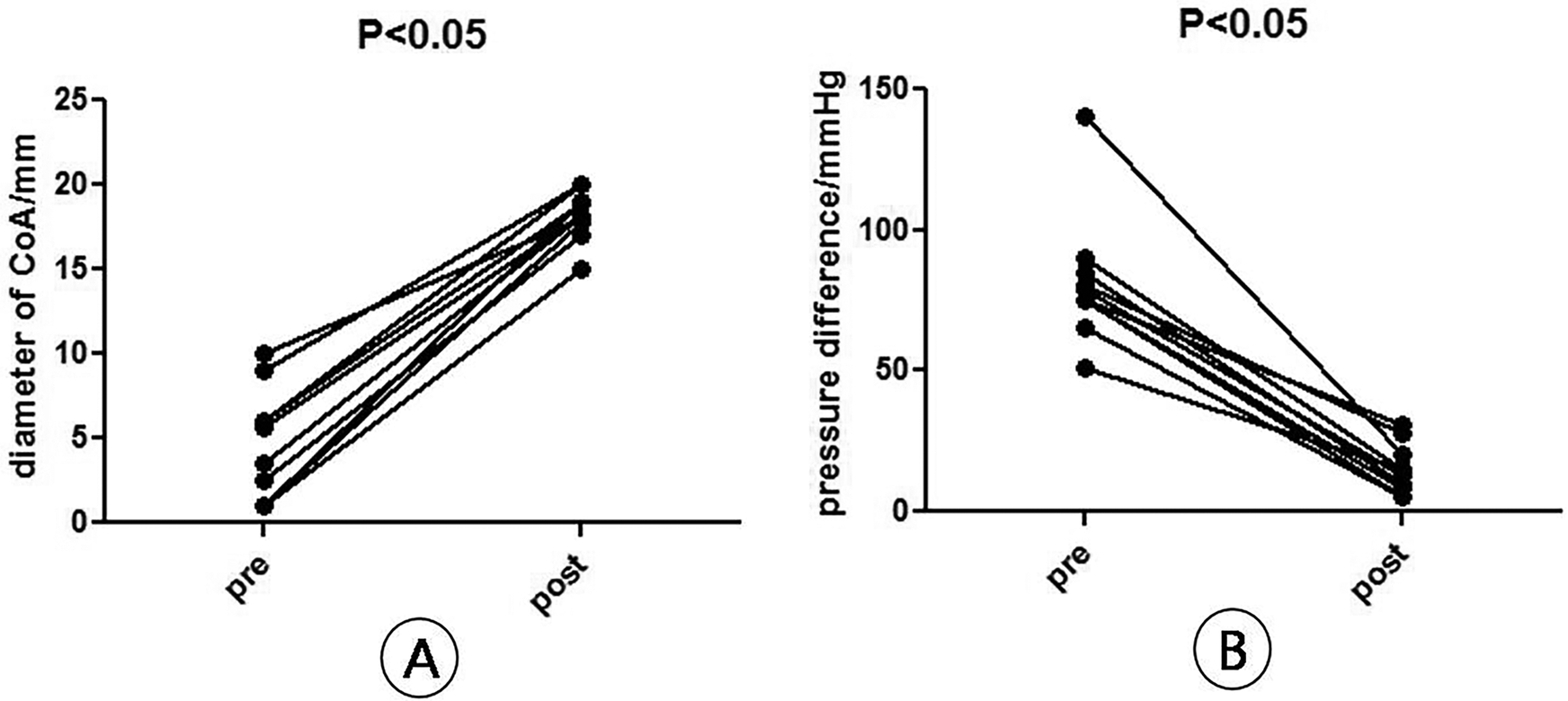 Diameter and pressure difference (B) at the narrowest point of arch constriction before and after surgery. (A) Diameter of CoA, n = 10, means ± SD, pre vs. post, P < 0.05; (B) pressure difference of CoA, n = 10, means ± SD, pre vs. post, P < 0.05.