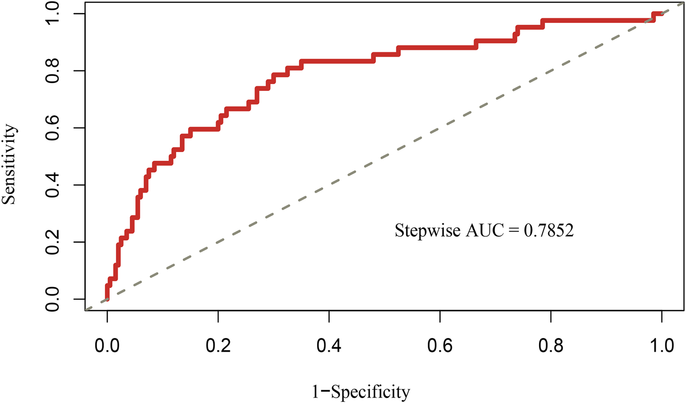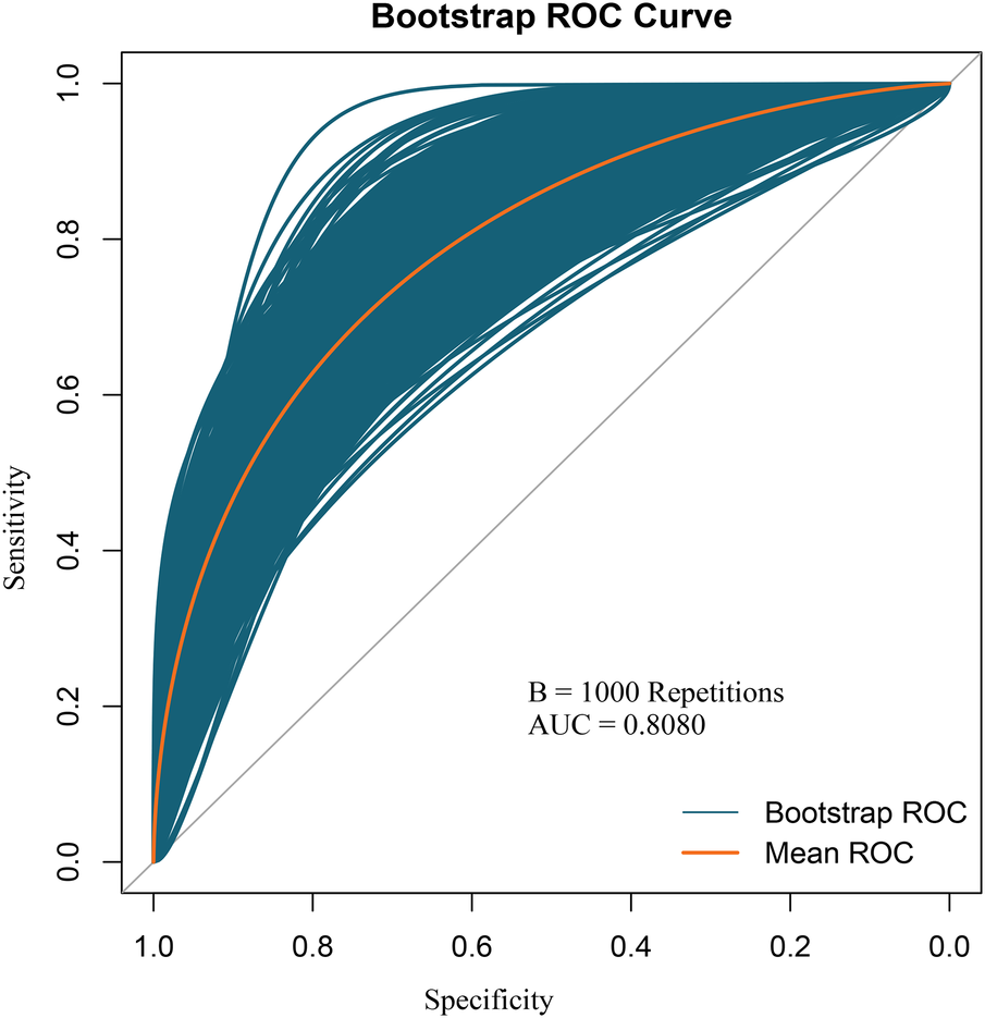 Internal validation of the nomogram using the bootstrap sampling. The ROC curve was measured by bootstrapping for 1,000 repetitions, and the AUC of the bootstrap stepwise model was showed.