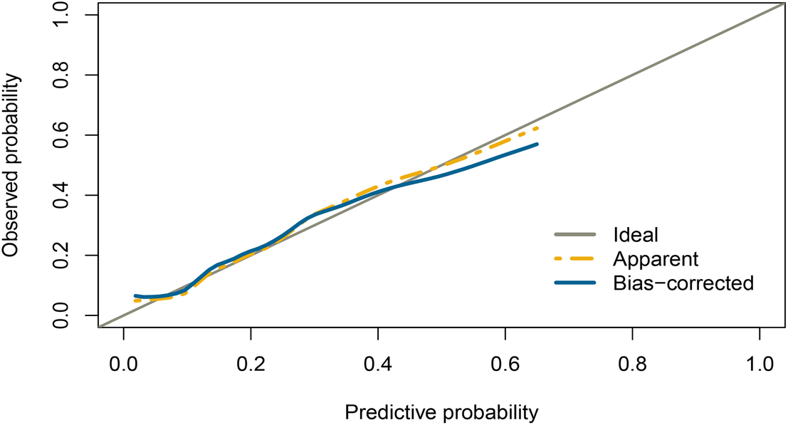 Internal validation of the nomogram using the bootstrap sampling. Calibration curve for predicted probability of the new-onset POAF nomogram. The curves describe the calibration of the nomogram in terms of agreement between predicted risks (x-axes) and actual outcomes (y-axes). The diagonal line indicates perfect prediction by an ideal model. The curve indicates the performance of the model.