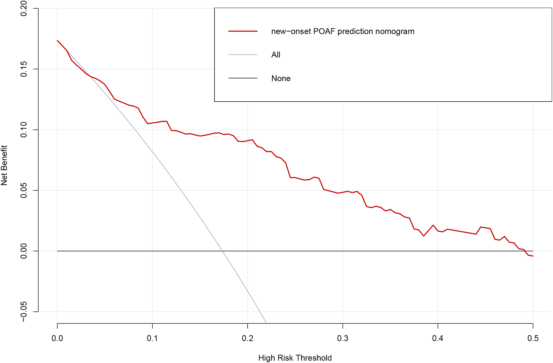 Decision curve analysis for the prediction model. Red solid line: Prediction model. Tin slash line: Assume all patients have new-onset POAF. Solid horizontal line:Assume no patients have new-onset POAF. The graph indicates the expected net benefit per patient relative to the nomogram prediction of new-onset POAF. POAF: Postoperative atrial fibrillation.