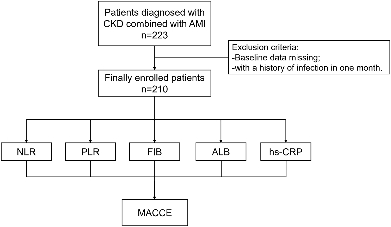 Study protocol. The flowchart of enrollment of study patients. CKD, chronic kidney disease; AMI, acute myocardial infarction; NLR, neutrophil to lymphocyte ratio; PLR, platelet to lymphocyte ratio; FIB, fibrinogen; ALB, albumin; hs-CRP, high-sensitivity C-reactive protein; MACCE, major adverse cardiac and cerebrovascular events.