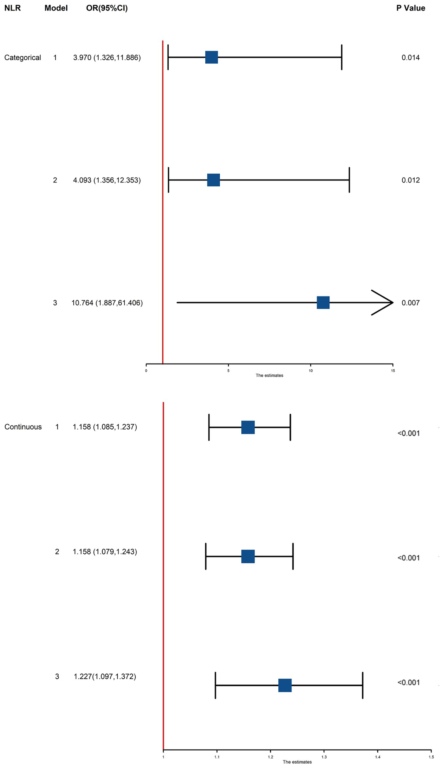 We included these biomarkers that showed significant effects in multivariate logistic analysis, NLR (OR = 3.970, 95%CI: 1.326–11.886, P = 0.014) still showed a positive correlation with a higher risk of composite outcome. After adjusting for age and sex (Model 2), this association remained significant (OR = 4.093, 95% CI: 1.356–12.353, P = 0.012). Additional adjustment as Model 3, the NLR still showed a positive correlation with a higher risk of the outcome (OR = 10.764, 95% CI: 1.887–61.406, P = 0.007) (Table 4) (Figure 2).